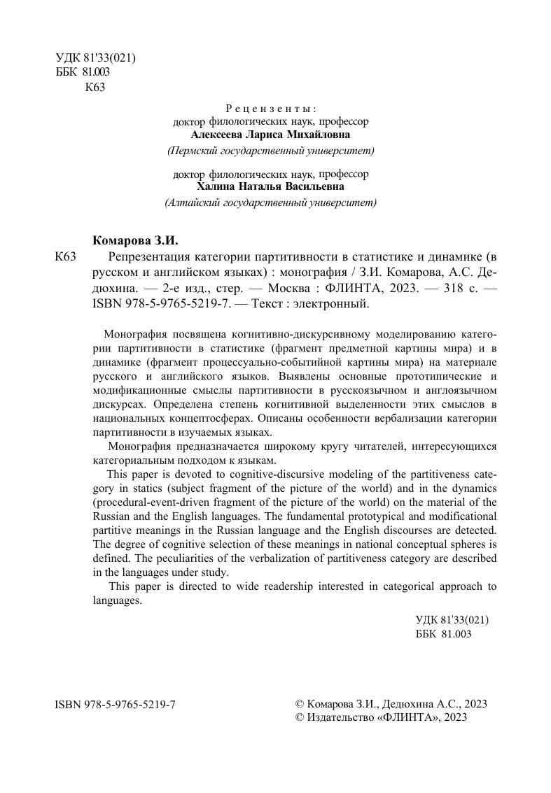 Монография посвящена когнитивно-дискурсивному моделированию категории партитивности в статистике (фрагмент предметной картины мира) и в динамике (фрагмент процессуально-событийной картины мира) на материале русского и английского языков. Выявлены основные прототипические и модификационные смыслы партитивности в русскоязычном и англоязычном дискурсах. Определена степень когнитивной выделенности этих смыслов в национальных концептосферах. Описаны особенности вербализации категории партитивности в изучаемых языках.