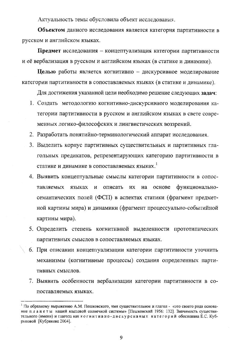 Монография предназначается широкому кругу читателей, интересующихся категориальным подходом к языкам. This paper is devoted to cognitive-discursive modeling of the partitiveness category in statics (subject fragment of the picture of the world) and in the dynamics (procedural-event-driven fragment of the picture of the world) on the material of the Russian and the English languages. The fundamental prototypical and modificational partitive meanings in the Russian language and the English discourses are detected. The degree of cognitive selection of these meanings in national conceptual spheres is defined. The peculiarities of the verbalization of partitiveness category are described in the languages under study.