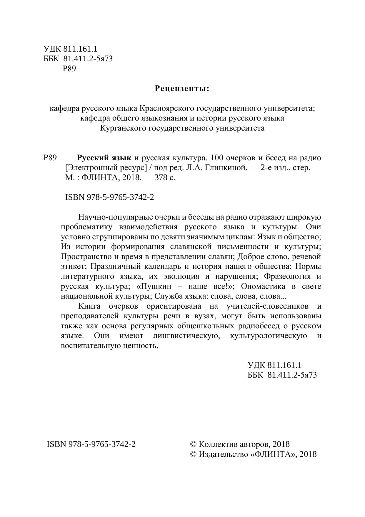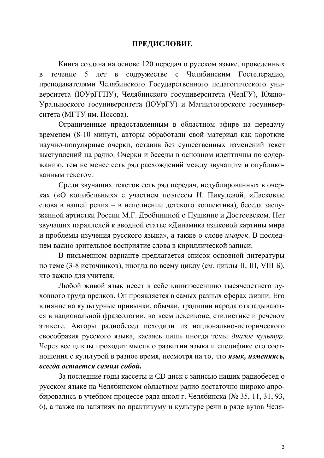 Научно-популярные очерки и беседы на радио отражают широкую проблематику взаимодействия русского языка и культуры. Они условно сгруппированы по девяти значимым циклам: Язык и общество; Из истории формирования славянской письменности и культуры; Пространство и время в представлении славян; Доброе слово, речевой этикет; Праздничный календарь и история нашего общества; Нормы литературного языка, их эволюция и нарушения; Фразеология и русская культура; «Пушкин – наше все!»; Ономастика в свете национальной культуры; Служба языка: слова, слова, слова... Книга очерков ориентирована на учителей-словесников и преподавателей культуры речи в вузах, могут быть использованы также как основа регулярных общешкольных радиобесед о русском языке. Они имеют лингвистическую, культурологическую и воспитательную ценность.