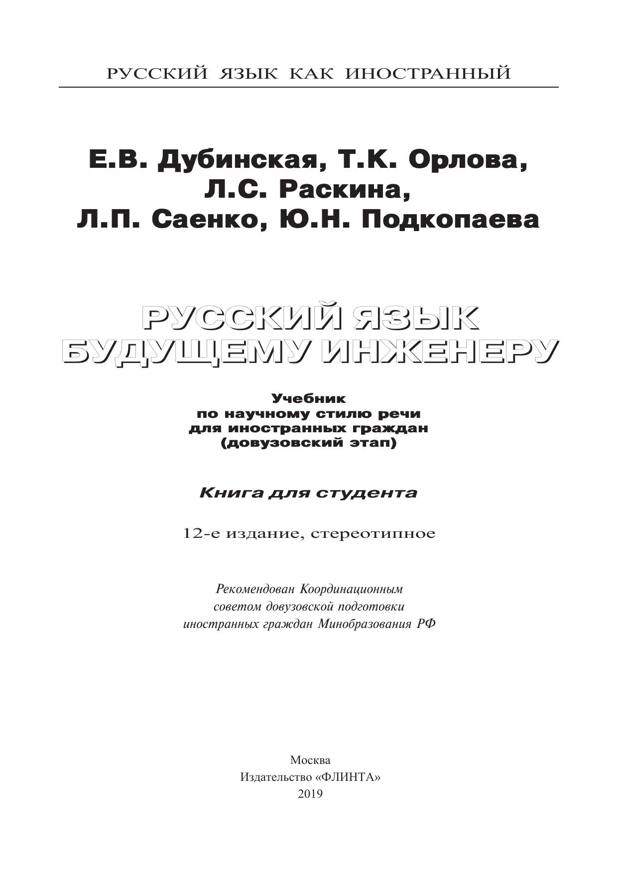 Русский язык как иностранный. Русский язык будущему инженеру: учебник по науучному стилю речи для иностранных граждан(довузовский этап) Книга для студентов.