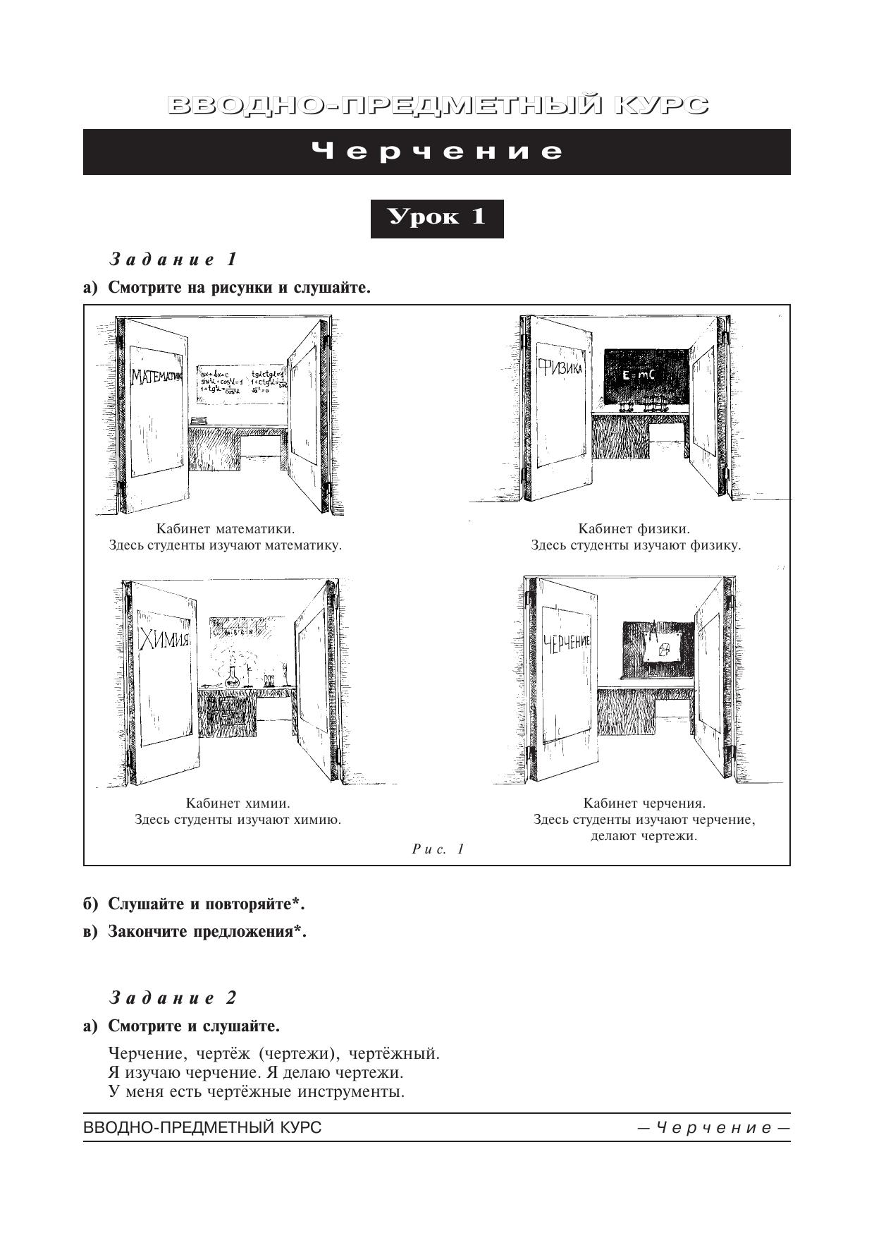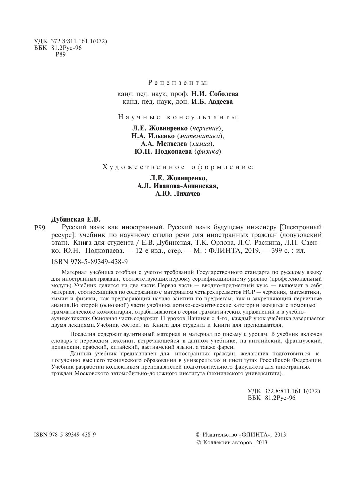 Материал учебника отобран с учетом Государственного стандарта по русскому языку для иностранных граждан соответствующих первому сертификационному уровню (профессиональный модуоль). Учебник делится на две части. Первая часть — вводно-предметный курс — включает в себя материал, соотносящийся по содержанию с материалом четырех предметов НСР — черчения, математики, химии и физики, как предваряющий начало занятий по предметам, так и закрепляющий первичные знания. Во второй (основной) части учебника логико-семантические категории вводятся с помощью граматического комментария, отрабатываются в серии граматических упражнений и в учебно-научных текстах. Основная часть содержит 11 уроков. Начиная с 4-го, каждый урок учебника завершается двумя лекциями. Учебник состоит из Книги для студента и Книги для преподавателя. Последняя содержит аудитивные материалы и материал письму к урокам. В учебник включен словарь с переводом лексики, встречающейся в данном учебнике, на английский, французский, испанский, арабский, китайский, вьетнамский языки, а также фарси. Данный учебник предназначен для иностранных граждан, желающих подготовиться к получению высшего тежнического образования в университетах и институтах Российской Федерации. Учебник разработан коллективом преподавателей подготовительного факультета для иностранных граждан Московского автомобильно-дорожного института (технического универститета).