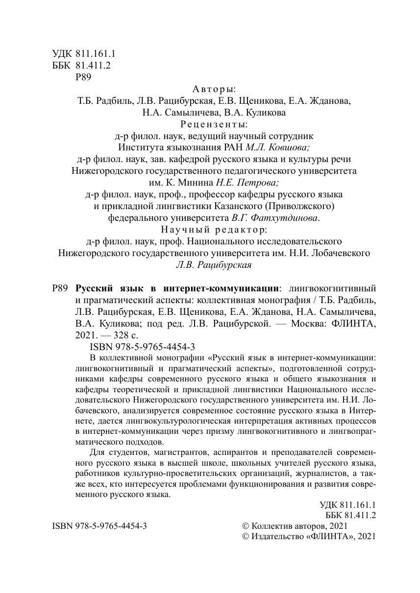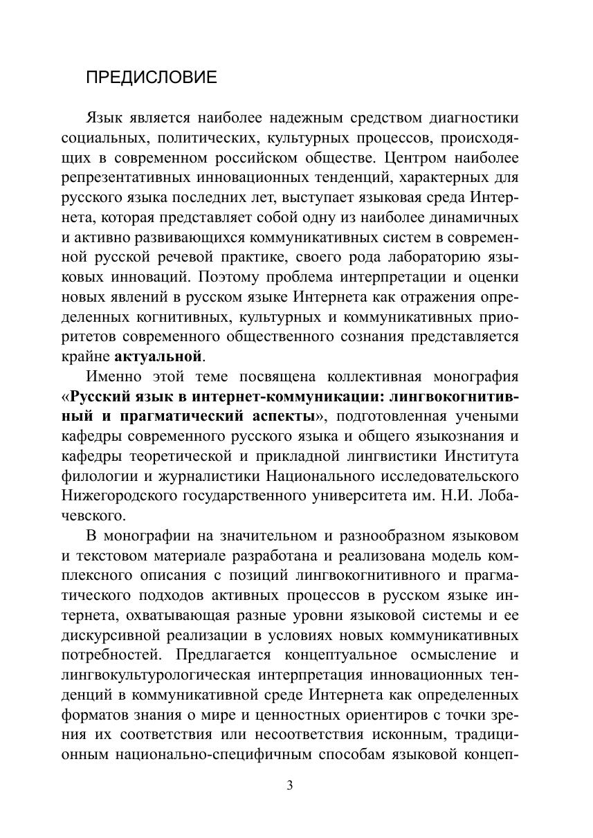 В коллективной монографии «Русский язык в интернет-коммуникации: лингвокогнитивный и прагматический аспекты», подготовленной сотрудниками кафедры современного русского языка и общего языкознания и кафедры теоретической и прикладной лингвистики Национального исследовательского Нижегородского государственного университета им. Н.И. Лобачевского, анализируется современное состояние русского языка в Интернете, дается лингвокультурологическая интерпретация активных процессов в интернет-коммуникации через призму лингвокогнитивного и лингвопраг-матического подходов.