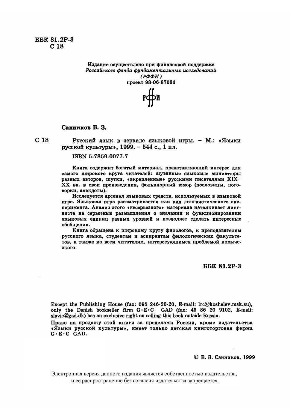 Книга содержит богатый материал, представляющий интерес для самого широкого круга читателей: шутливые языковые миниатюры разных авторов, шутки, "вкрапленные" русскими писателями XIX-XX вв. в свои произведения, фольклорный юмор (пословицы, поговорки, анекдоты). Исследуется арсенал языковых средств, используемых в языковой игре. Языковая игра рассматривается как вид лингвистического эксперимента. Анализ этого "несерьезного" материала наталкивает лингвиста на серьезные размышления о значении и функционировании языковых единиц разных уровней и позволяет сделать интересные обобщения. Книга обращена к широкому кругу филологов, к преподавателям русского языка, студентам и аспирантам филологических факультетов, а также ко всем читателям, интересующихся проблемой комического.