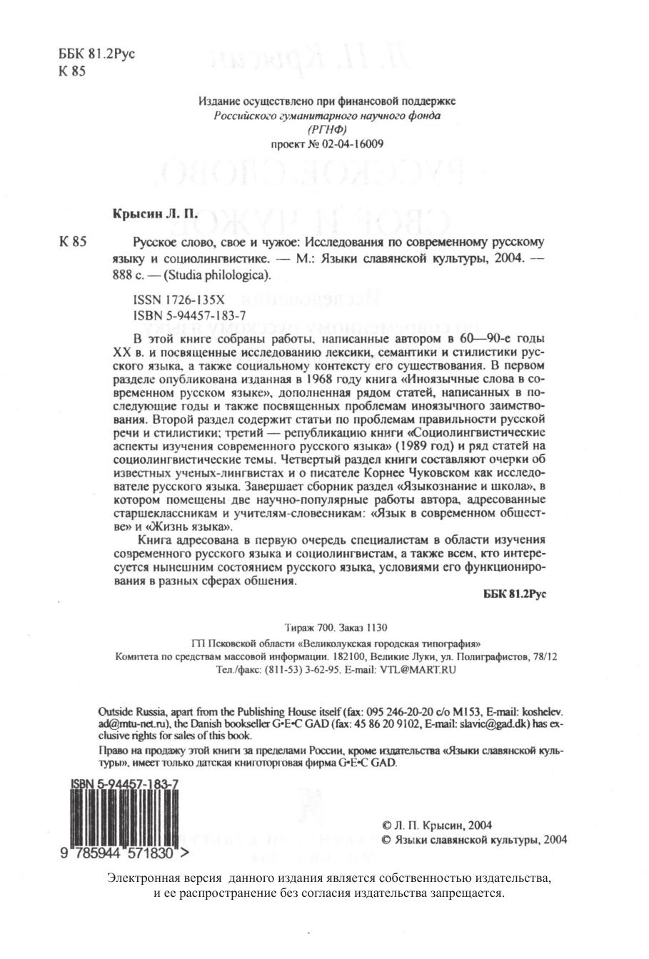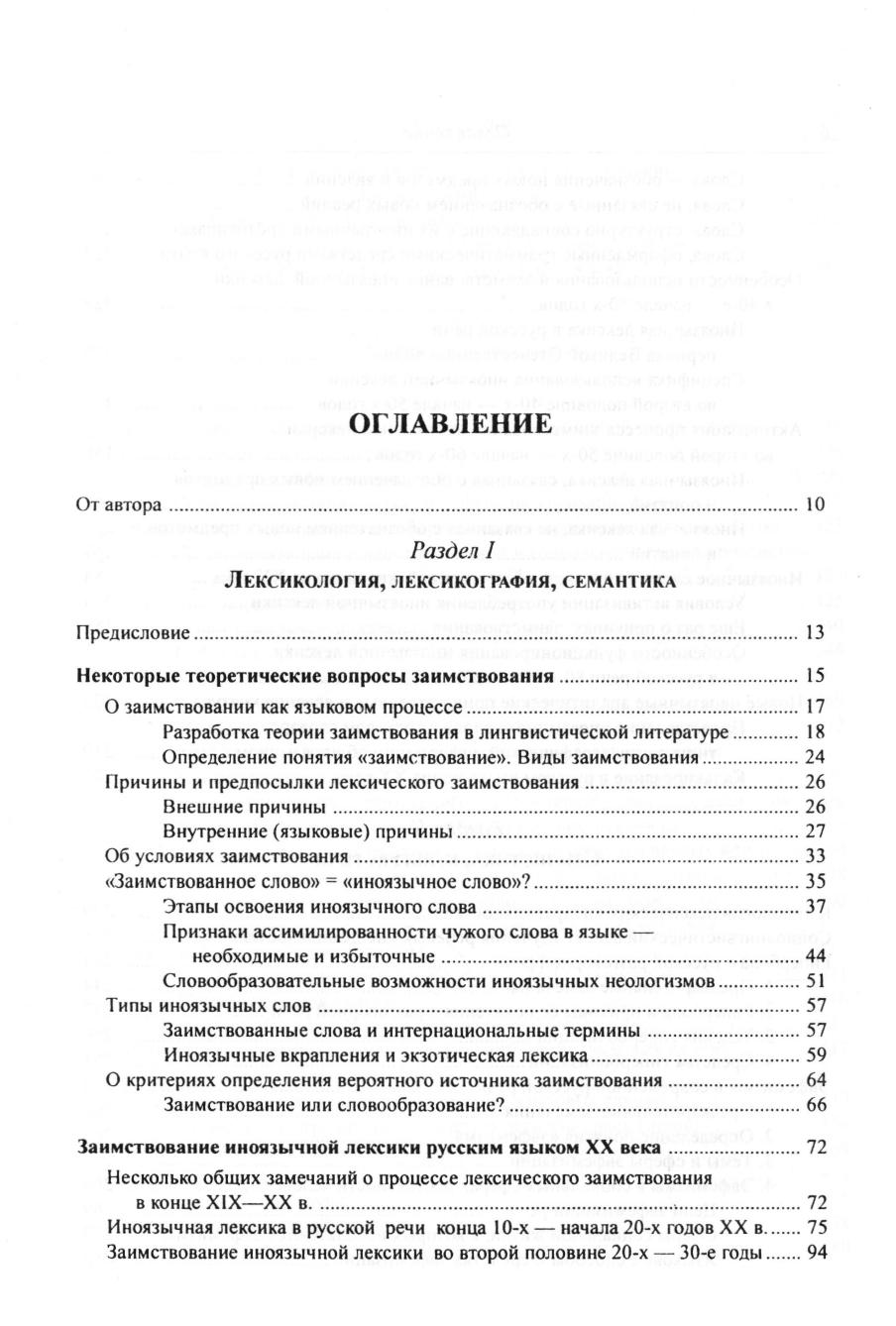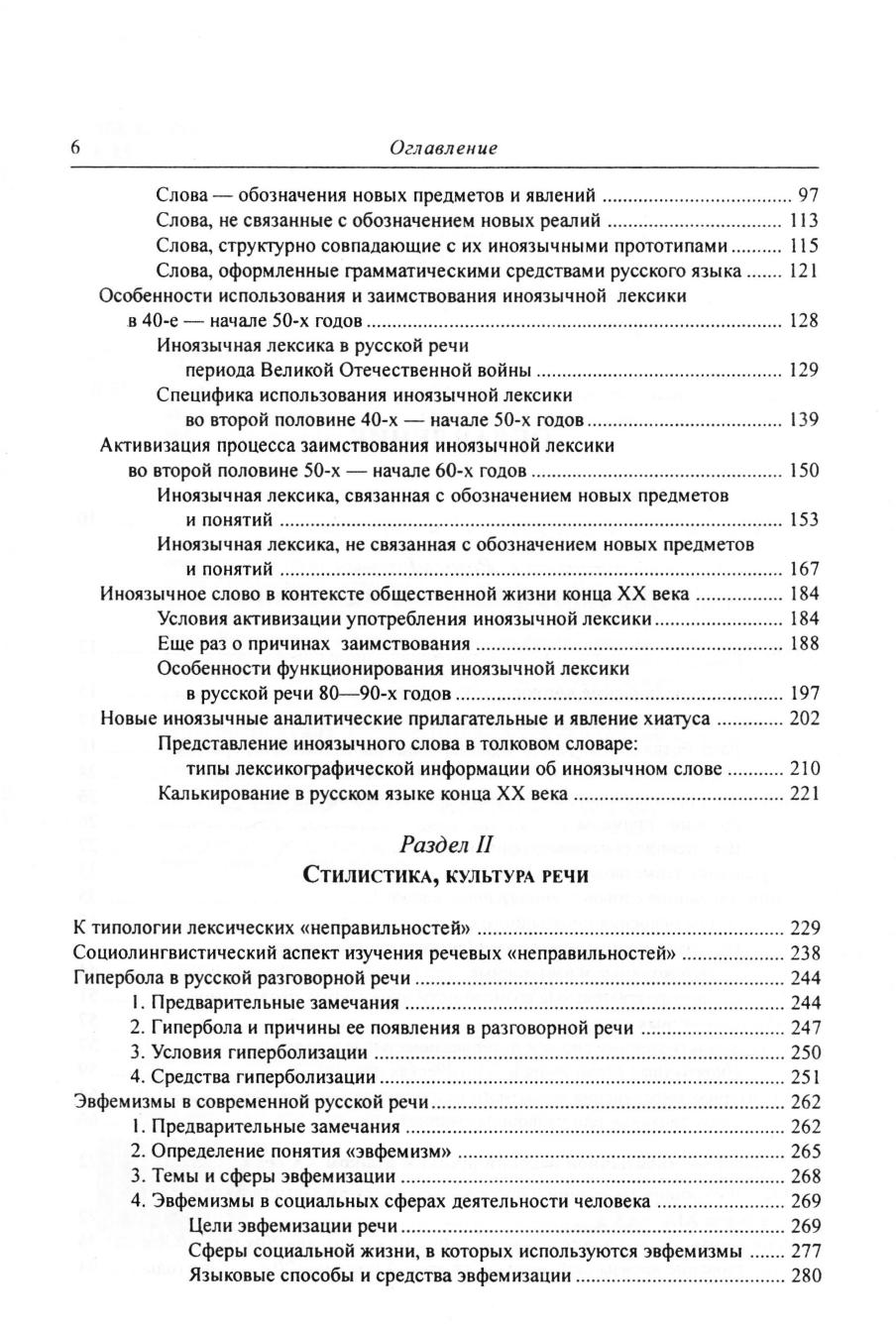 В этой книге собраны работы, написанные автором в 60-90-е годы XX в. и посвященные исследованию лексики, семантики и стилистики русского языка, а также социальному контексту его существования. В первом разделе опубликована изданная в 1968 году книга «Иноязычные слова в современном русском языке», дополненная рядом статей, написанных в последующие годы и также посвященных проблемам иноязычного заимствования. Второй раздел содержит статьи по проблемам правильности русской речи и стилистики, третий - републикацию книги «Социолингвистические аспекты изучения современного русского языка» (1989 год) и ряд статей на социолингвистические темы. Четвертый раздел книги составляют очерки об известных ученых-лингвистах и о писателе Корнее Чуковском как исследователе русского языка. Завершает сборник раздел «Языкознание и школа», в котором помещены две научно-популярные работы автора, адресованные старшеклассникам и учителям-словесникам: «Язык в современном обществе» и «Жизнь слова». Книга адресована в первую очередь специалистам в области изучения современного русского языка и социолингвистам, а также всем, кто интересуется нынешним состоянием русского языка, условиями его функционирования в разных сферах общения.