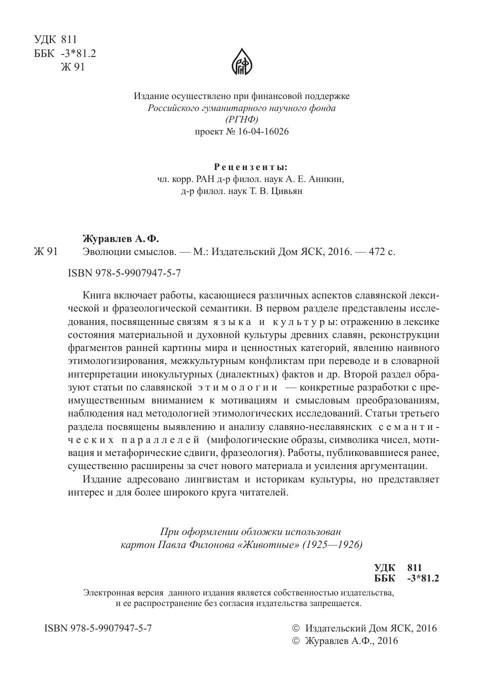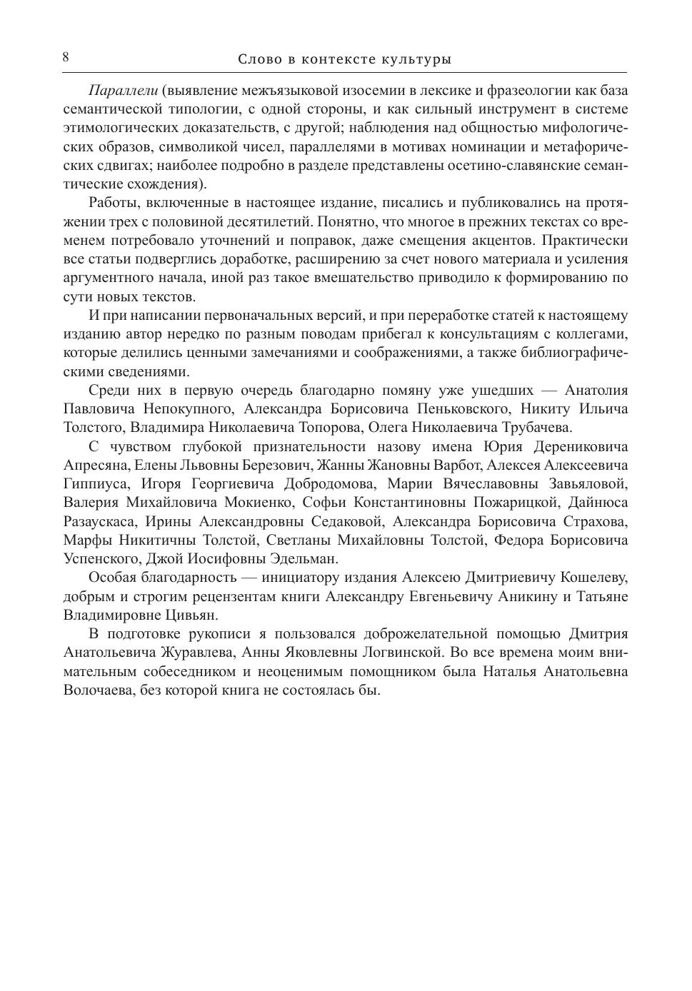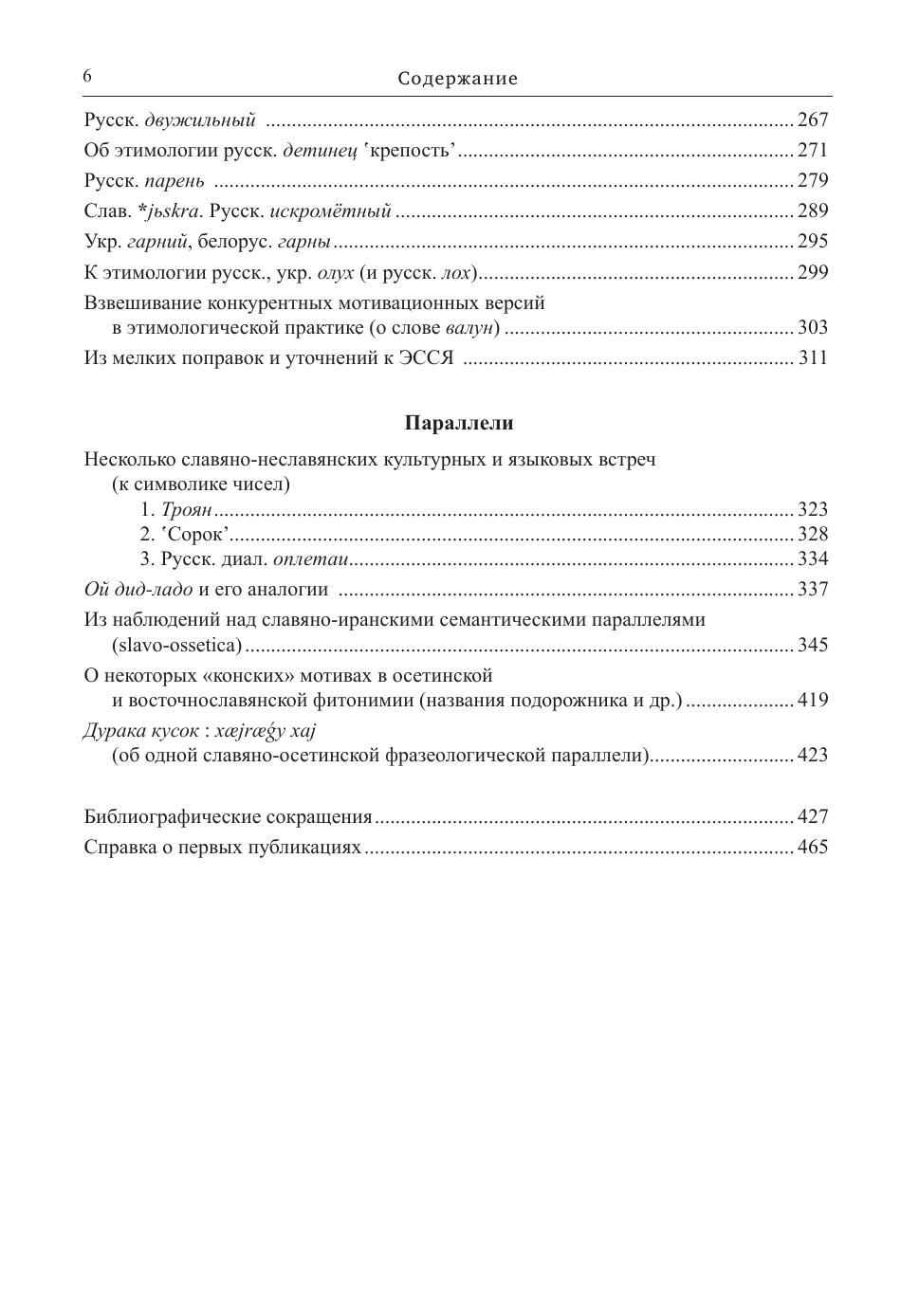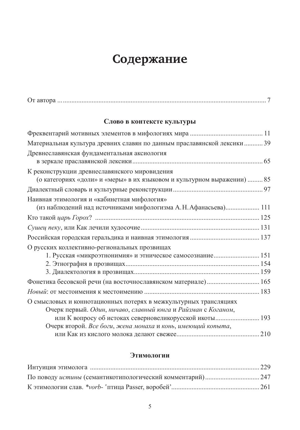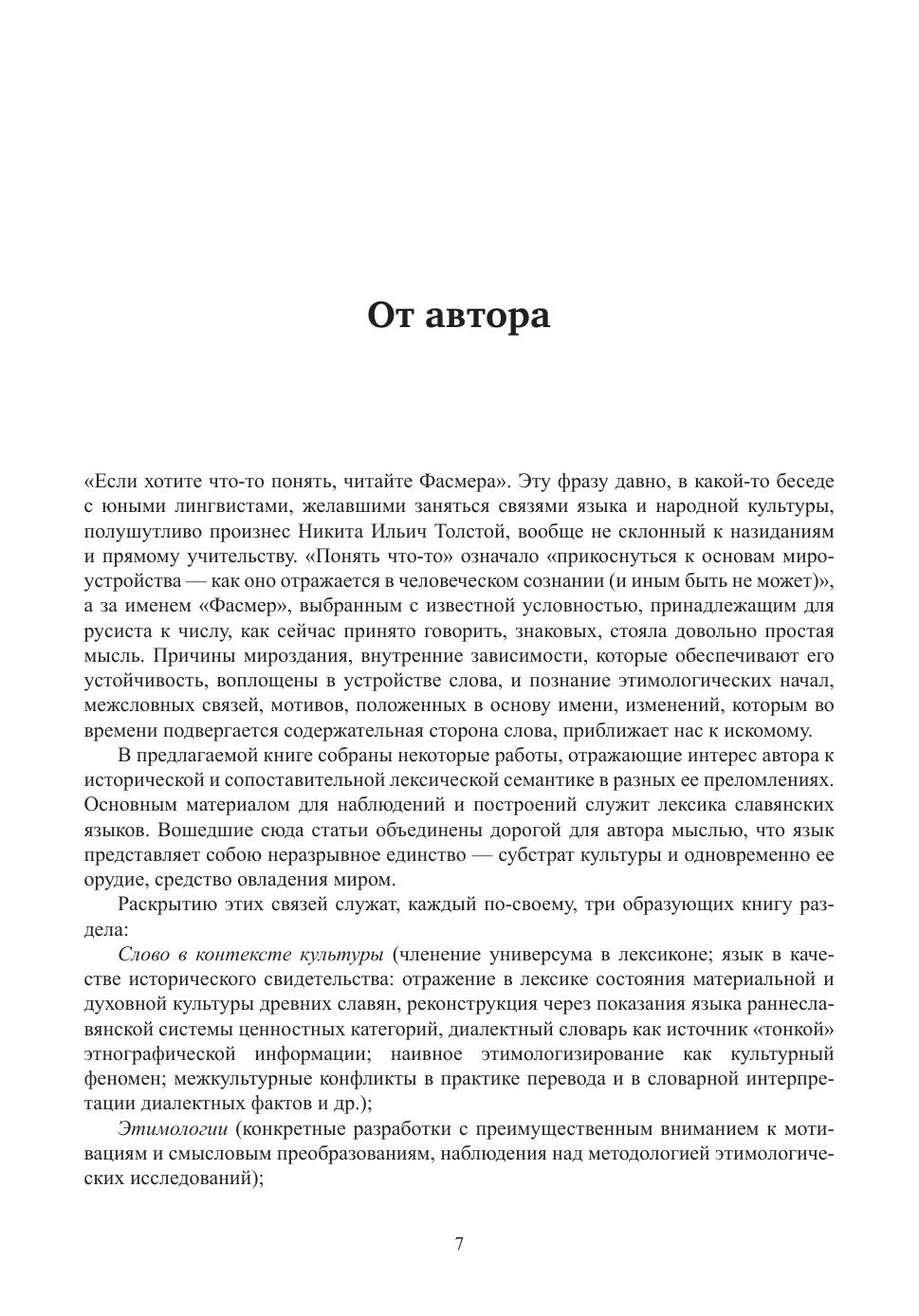 Книга включает работы, касающиеся различных аспектов славянской лексической и фразеологической семантики. В первом разделе представлены исследования, посвященные связям языка и культуры: отражению в лексике состояния материальной и духовной культуры древних славян, реконструкции фрагментов ранней картины мира и ценностных категорий, явлению наивного этимологизирования, межкультурным конфликтам при переводе и в словарной интерпретации инокультурных (диалектных) фактов и др. Второй раздел образуют статьи по славянской этимологии — конкретные разработки с преимущественным вниманием к мотивациям и смысловым преобразованиям, наблюдения над методологией этимологических исследований. Статьи третьего раздела посвящены выявлению и анализу славяно-неславянских семантических параллелей (мифологические образы, символика чисел, мотивация и метафорические сдвиги, фразеология). Работы, публиковавшиеся ранее, существенно расширены за счет нового материала и усиления аргументации. Издание адресовано лингвистам и историкам культуры, но представляет интерес и для более широкого круга читателей.