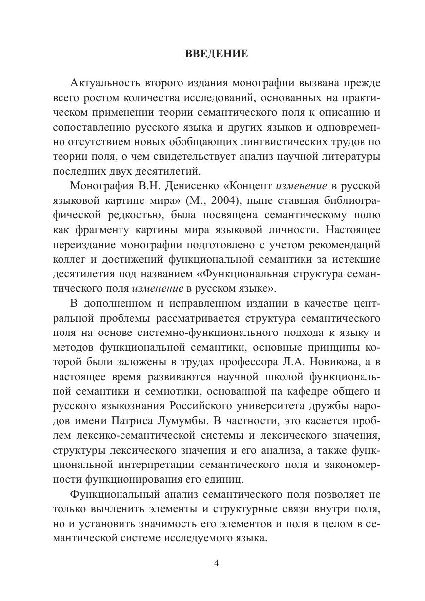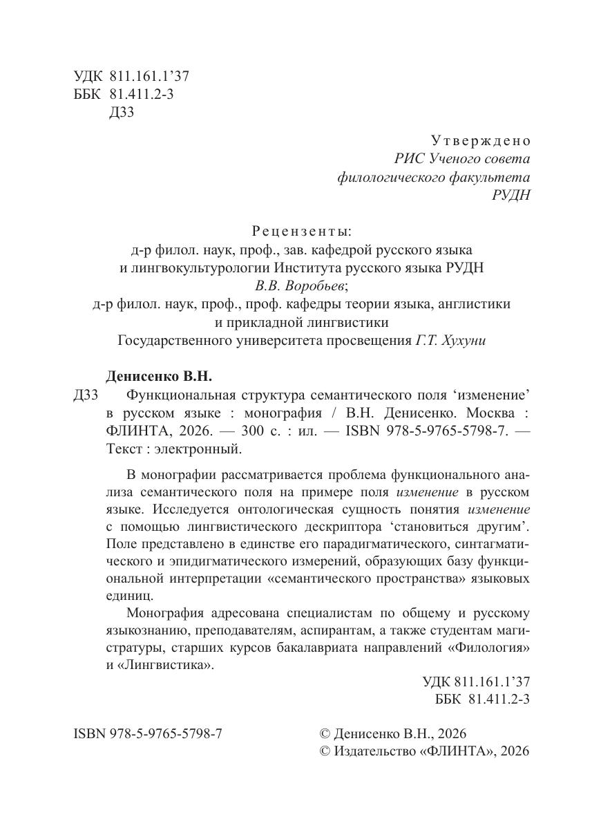 В монографии рассматривается проблема функционального анализа семантического поля на примере поля изменение в русском языке. Исследуется онтологическая сущность понятия изменение с помощью лингвистического дескриптора ‘становиться другим’. Поле представлено в единстве его парадигматического, синтагматического и эпидигматического измерений, образующих базу функциональной интерпретации «семантического пространства» языковых единиц. Монография адресована специалистам по общему и русскому языкознанию, преподавателям, аспирантам, а также студентам магистратуры, старших курсов бакалавриата направлений «Филология» и «Лингвистика».