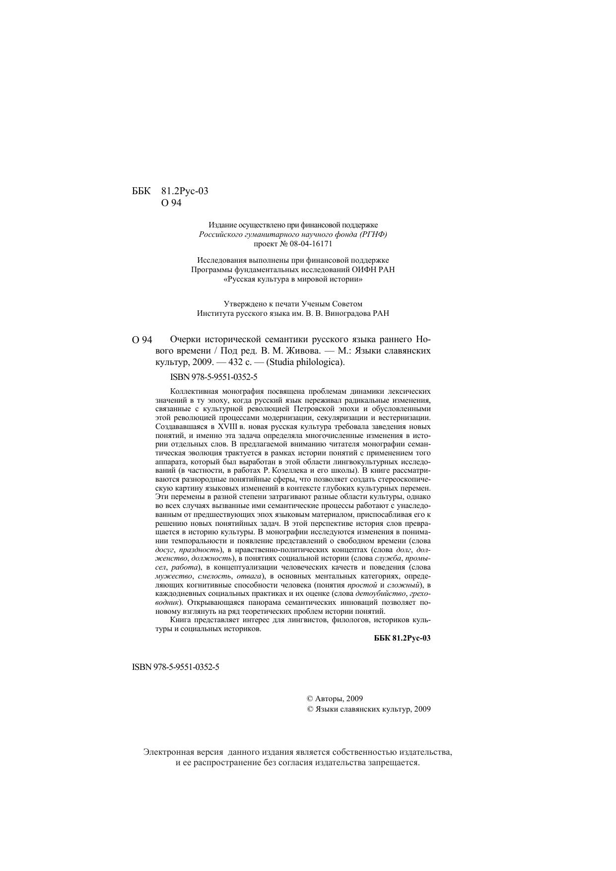 Коллективная монография посвящена проблемам динамики лексических значений в ту эпоху, когда русский язык переживал радикальные изменения, связанные с культурной революцией Петровской эпохи и обусловленными этой революцией процессами модернизации, секуляризации и вестернизации. Создававшаяся в XVIII в. новая русская культура требовала заведения новых понятий, и именно эта задача определяла многочисленные изменения в истории отдельных слов. В предлагаемой вниманию читателя монографии семантическая эволюция трактуется в рамках истории понятий с применением того аппарата, который был выработан в этой области лингвокультурных исследований (в частности, в работах Р. Козеллека и его школы). В книге рассматриваются разнородные понятийные сферы, что позволяет создать стереоскопическую картину языковых изменений в контексте глубоких культурных перемен. Эти перемены в разной степени затрагивают разные области культуры, однако во всех случаях вызванные ими семантические процессы работают с унаследованным от предшествующих эпох языковым материалом, приспосабливая его к решению новых понятийных задач. В этой перспективе история слов превращается в историю культуры. В монографии исследуются изменения в понимании темпоральности и появление представлений о свободном времени (слова досуг, праздность), в нравственно-политических концептах (слова долг, долженство, должность), в понятиях социальной истории (слова служба, промысел, работа), в концептуализации человеческих качеств и поведения (слова мужество, смелость, отвага), в основных ментальных категориях, определяющих когнитивные способности человека (понятия простой и сложный), в каждодневных социальных практиках и их оценке (слова детоубийство, греховодник). Открывающаяся панорама семантических инноваций позволяет по-новому взглянуть на ряд теоретических проблем истории понятий. Книга представляет интерес для лингвистов, филологов, историков культуры и социальных историков.