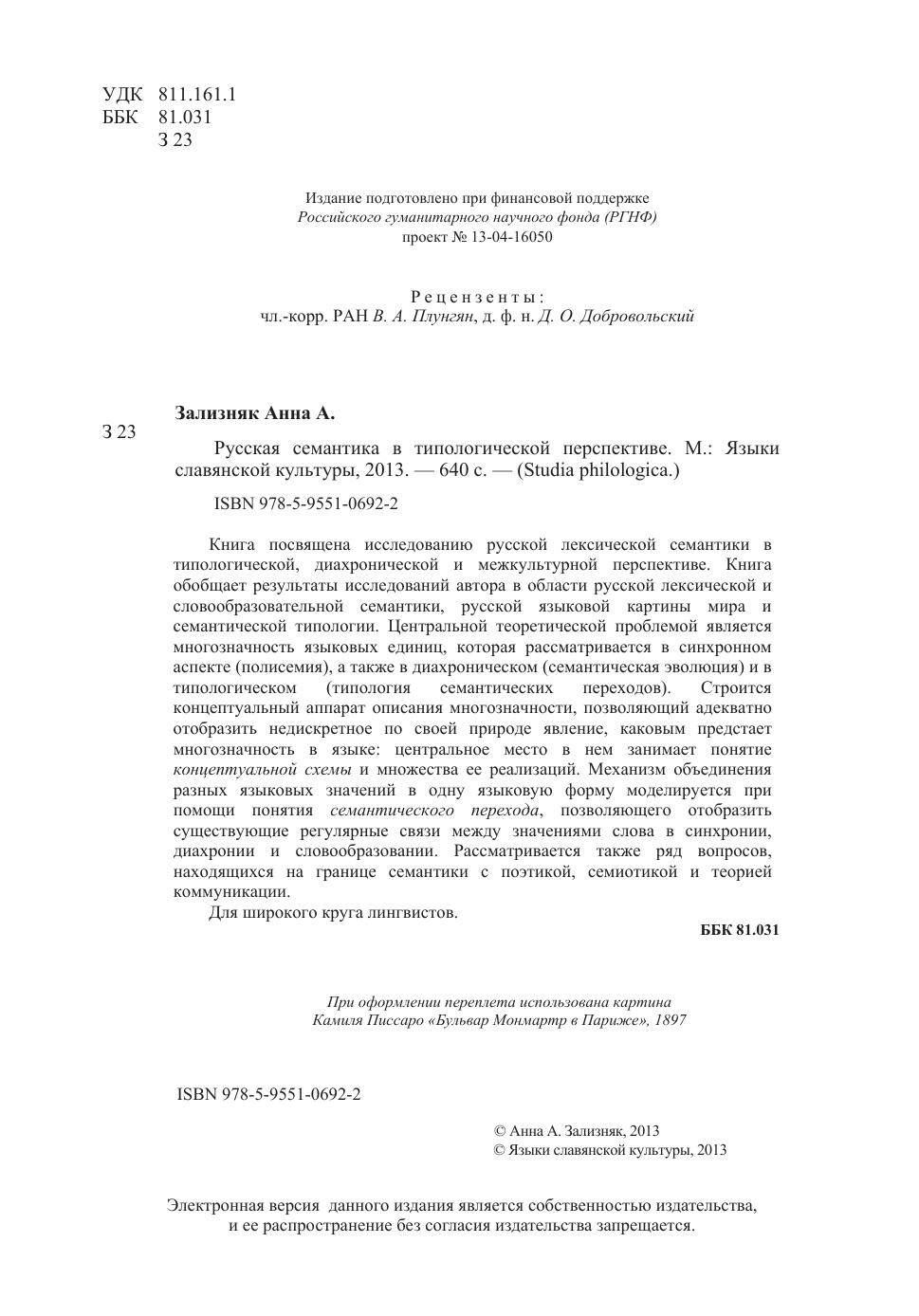 Книга посвящена исследованию русской лексической семантики в типологической, диахронической и межкультурной перспективе. Книга обобщает результаты исследований автора в области русской лексической и словообразовательной семантики, русской языковой картины мира и семантической типологии. Центральной теоретической проблемой является многозначность языковых единиц, которая рассматривается в синхронном аспекте (полисемия), а также в диахроническом (семантическая эволюция) и в типологическом (типология семантических переходов). Строится концептуальный аппарат описания многозначности, позволяющий адекватно отобразить недискретное по своей природе явление, каковым предстает многозначность в языке: центральное место в нем занимает понятие концептуальной схемы и множества ее реализаций. Механизм объединения разных языковых значений в одну языковую форму моделируется при помощи понятия семантического перехода, позволяющего отобразить существующие регулярные связи между значениями слова в синхронии, диахронии и словообразовании. Рассматривается также ряд вопросов находящихся на границе семантики с поэтикой, семиотикой и теорией коммуникации. Для широкого круга лингвистов.