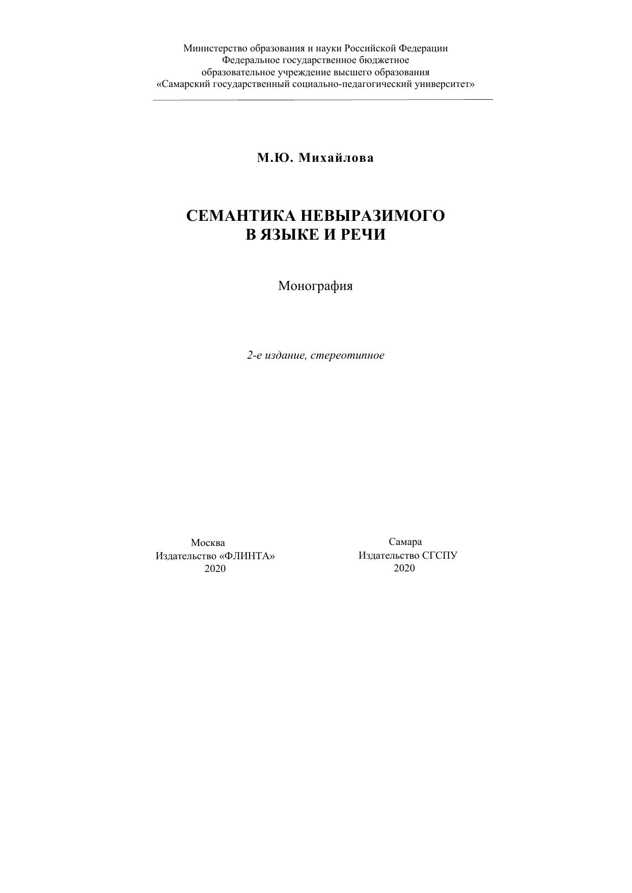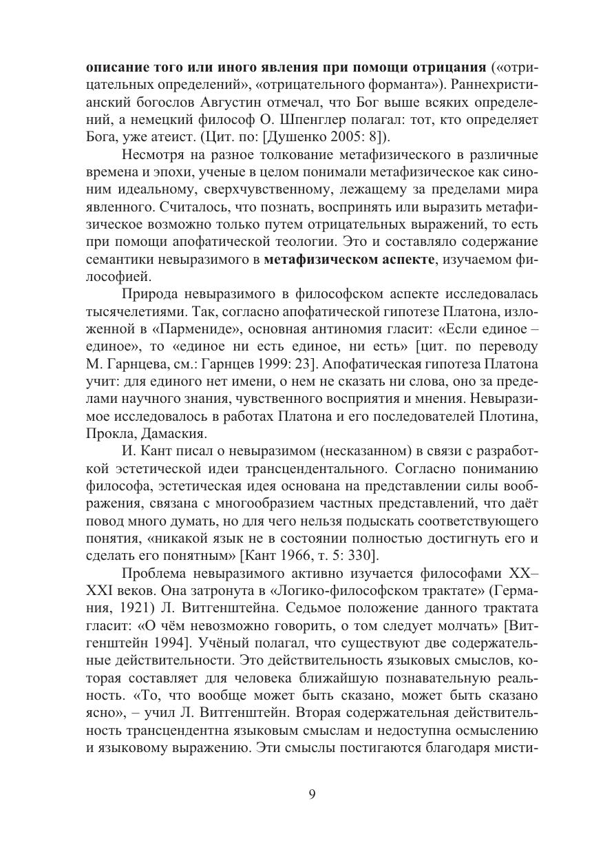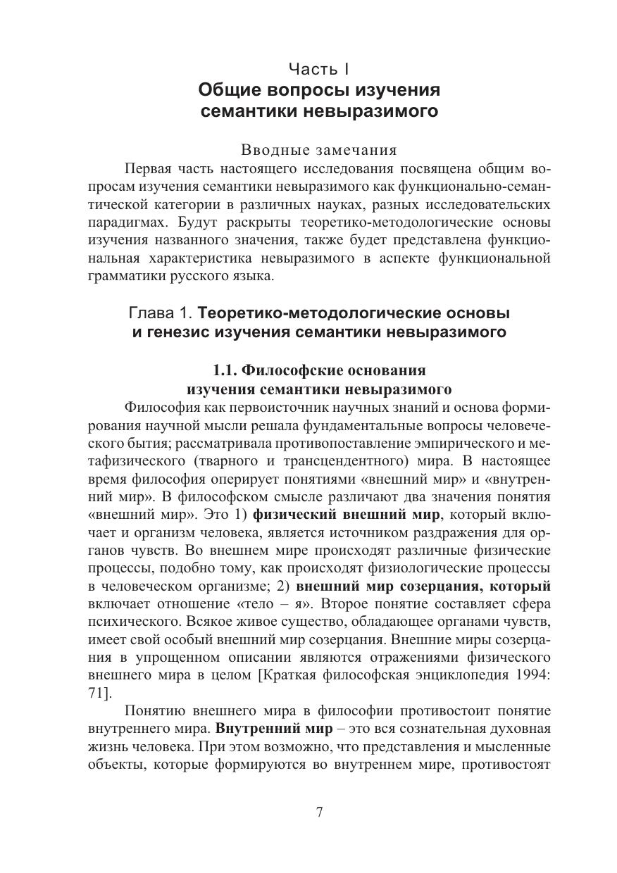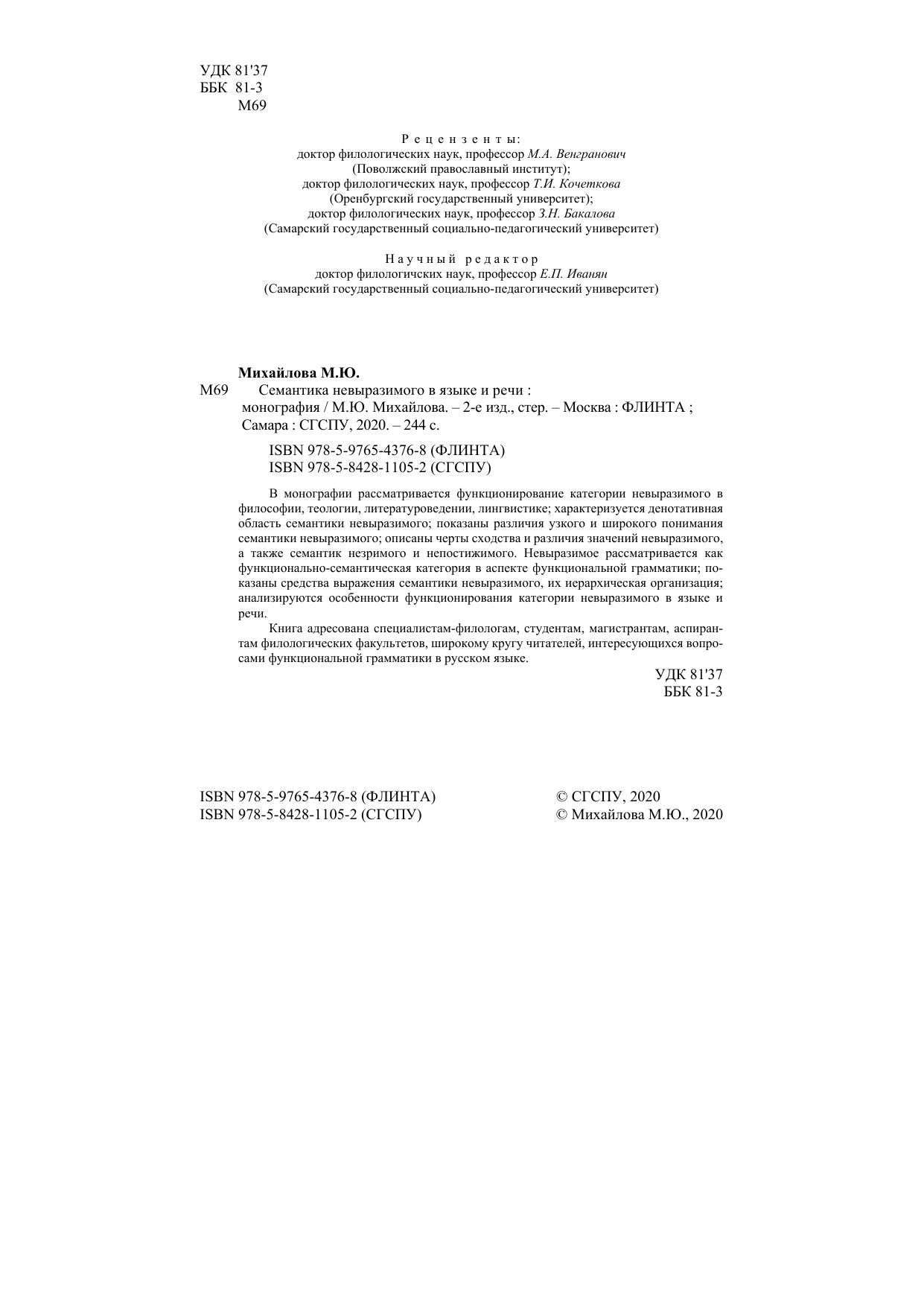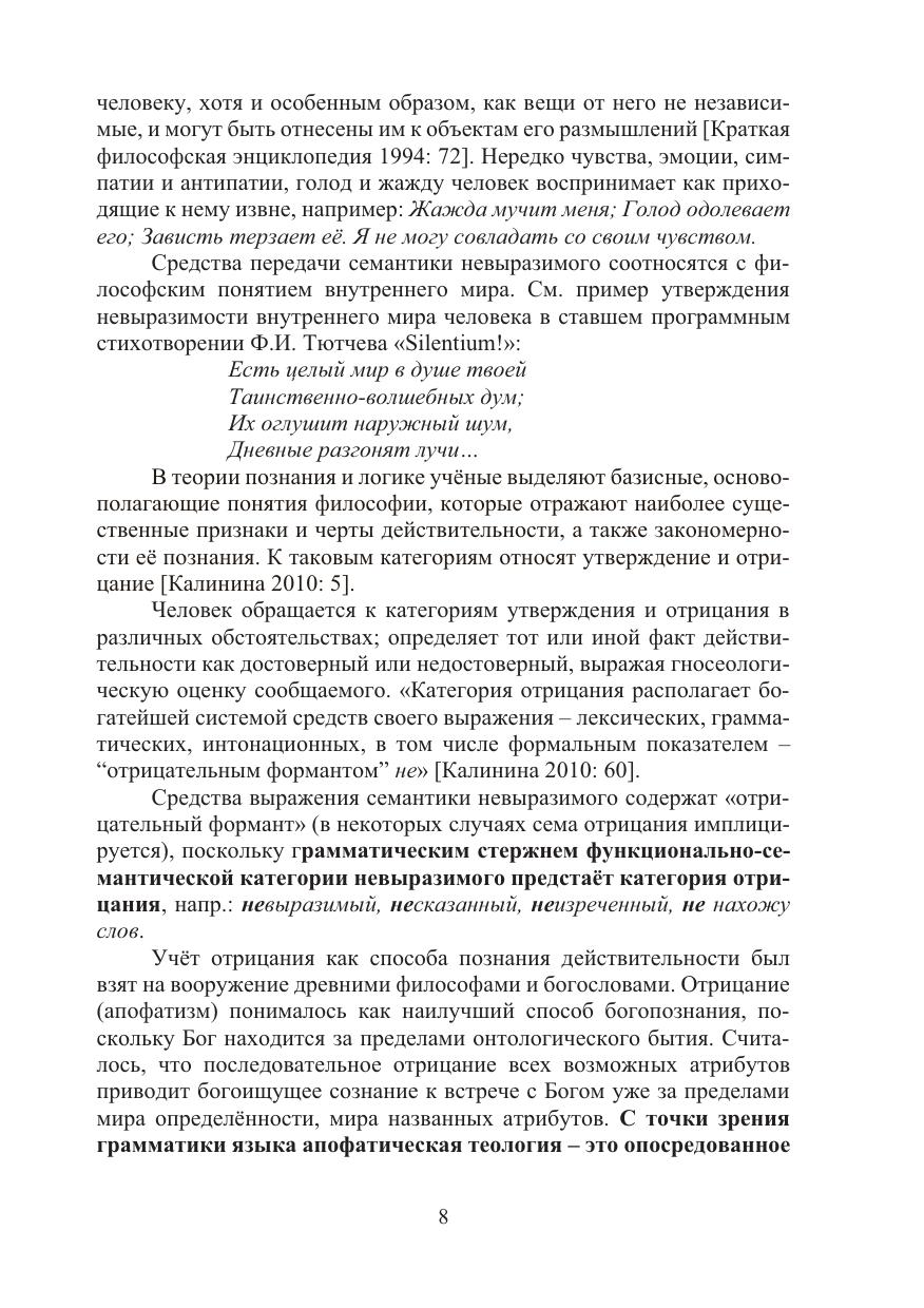 философии, теологии, литературоведении, лингвистике; характеризуется денотативная область семантики невыразимого; показаны различия узкого и широкого понимания семантики невыразимого; описаны черты сходства и различия значений невыразимого, а также семантик незримого и непостижимого. Невыразимое рассматривается как функционально-семантическая категория в аспекте функциональной грамматики; показаны средства выражения семантики невыразимого, их иерархическая организация;