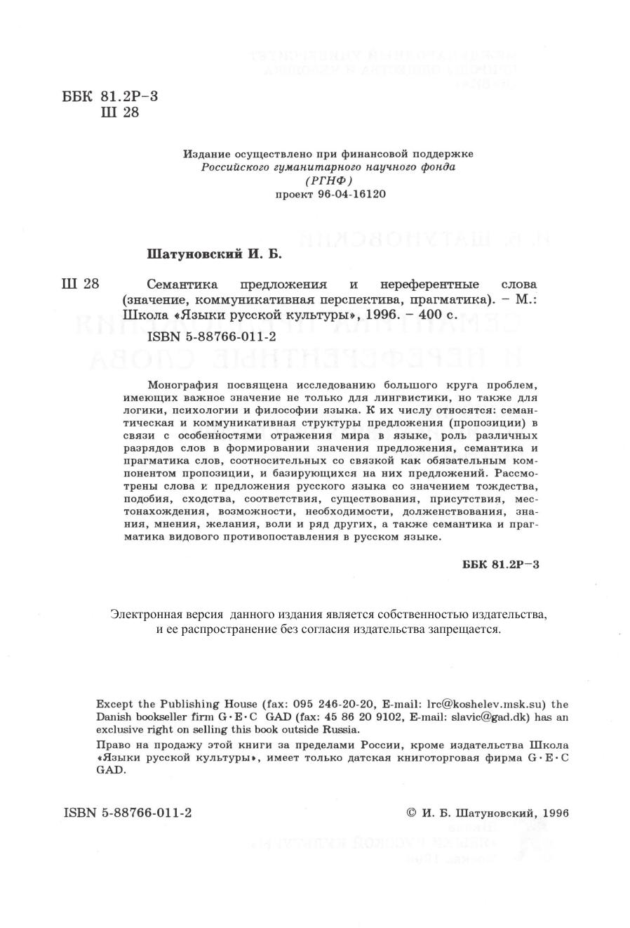 Монография посвящена исследованию большого круга сложных проблем, имеющих важное значение не только для лингвистики, но также для логики, психологии и философии языка. К их числу относятся: семантическая и коммуникативная структура предложения (пропозиции) в связи с особенностями отражения мира в языке, роль различных разрядов слов в формировании значения предложения, семантика и прагматика слов, соотносительных со связкой как обязательным компонентом пропозиции, и базирующихся на них предложений. Рассмотрены слова и предложения русского языка со значением тождества, подобия, сходства,соответствия, существования, присутствия, местонахождения, возможности, необходимости, долженствования, знания, мнения, веры, желания, воли и ряд других, а также семантика и прагматика видового противопоставления в русском языке.