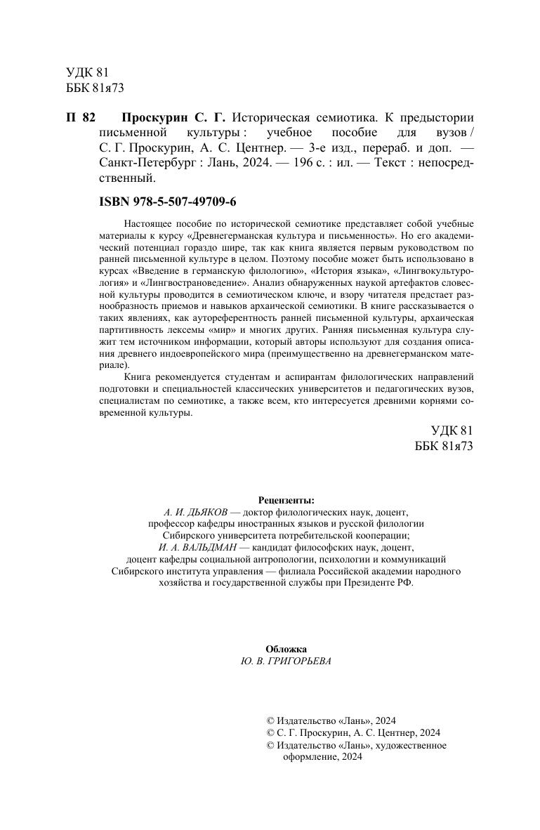 Настоящее пособие по исторической семиотике представляет собой учебные материалы к курсу «Древнегерманская культура и письменность». Но его академиче-ский потенциал гораздо шире, так как книга является первым руководством по ранней письменной культуре в целом. Поэтому пособие может быть использовано в курсах «Введение в германскую филологию», «История языка», «Лингвокультурология» и «Лингвострановедение». Анализ обнаруженных наукой артефактов словесной культуры проводится в семиотическом ключе, и взору читателя предстает разнообразность приемов и навыков архаической семиотики. В книге рассказывается о таких явлениях, как аутореферентность ранней письменной культуры, архаическая партитивность лексемы «мир» и многих других. Ранняя письменная культура служит тем источником информации, который авторы используют для создания описания древнего индоевропейского мира (преимущественно на древнегерманском материале). Книга рекомендуется студентам и аспирантам филологических направлений подготовки и специальностей классических университетов и педагогических вузов, специалистам по семиотике, а также всем, кто интересуется древними корнями современной культуры.
