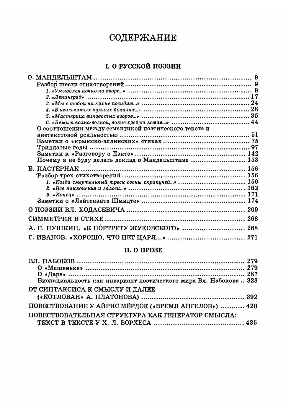 В книге собраны статьи, печатавшиеся в 1960-90 годах преимущественно в малодоступных научных периодических изданиях, отечественных и зарубежных, а также ранее неопубликованные. Тематика книги широка и разнообразна: русская поэзия, прежде всего О. Мандельштам (автор стоял у истоков отечественного мандельштамоведения) и Б. Пастернак, и русская и зарубежная проза XX века (в центре В. Набоков, но также А. Платонов, X.Л. Борхес, А. Мердок), общая поэтика - здесь автору принадлежат признанные классическими работы о метафоре и о коммуникативном строе лирики, фольклор и такие "малые формы", как, с одной стороны, евангельская притча и, с другой стороны, советский лозунг, общая и частная семиотика - автор формировался в недрах московско-тартуской семиотической школы, структурная лингвистика - от семантики союзов до структуры и семантики матерных ругательств, наконец, философия с семиотической точки зрения (проблема того, "что есть истина", философские миры Вл. Соловьева и Л. Шестова). Общий знаменатель всего этого многообразия - попытки автора вскрыть внутреннюю структуру изучаемых текстов и явлений, найти их инварианты, понять, как они "работают". Для научных работников, широкого круга специалистов.