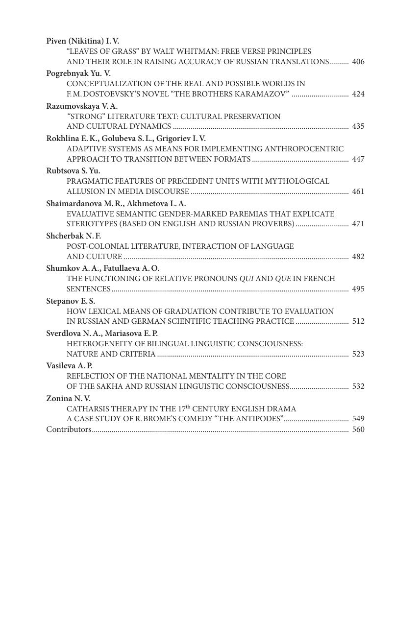 В сборнике представлены последние разработки ученых России и зарубежных стран в исследовании актуальных лингвистических процессов, современной методики преподавания языка и перевода, рассмотрен широкий спектр актуальных вопросов изучения роли перевода в условиях глобализации, широкого информационного обмена, взаимодействия языков и культур. Сборник является отражением позиций современных лингвистов на развитие традиционных проблем языка и межъязыковой коммуникации, звучание которых приобретает сегодня новые тона и оттенки. Материалы сборника будут полезны всем исследователям в области лингвистики, перевода, межкультурной коммуникации, лингводидактики и методики преподавания иностранных языков для специальных целей, а также всем интересующимся современными тенденциями в этих областях.