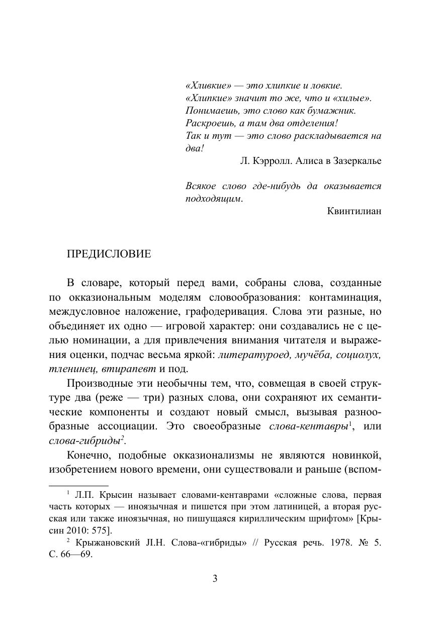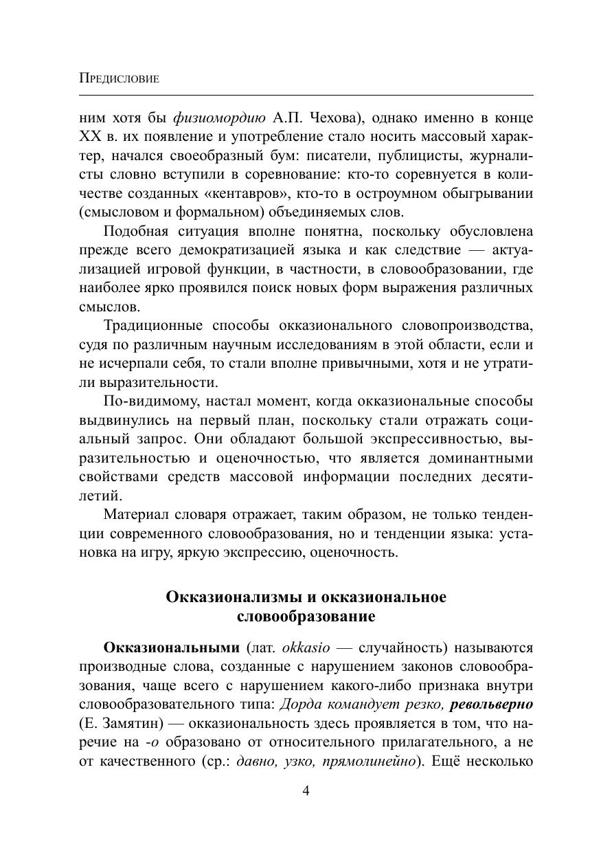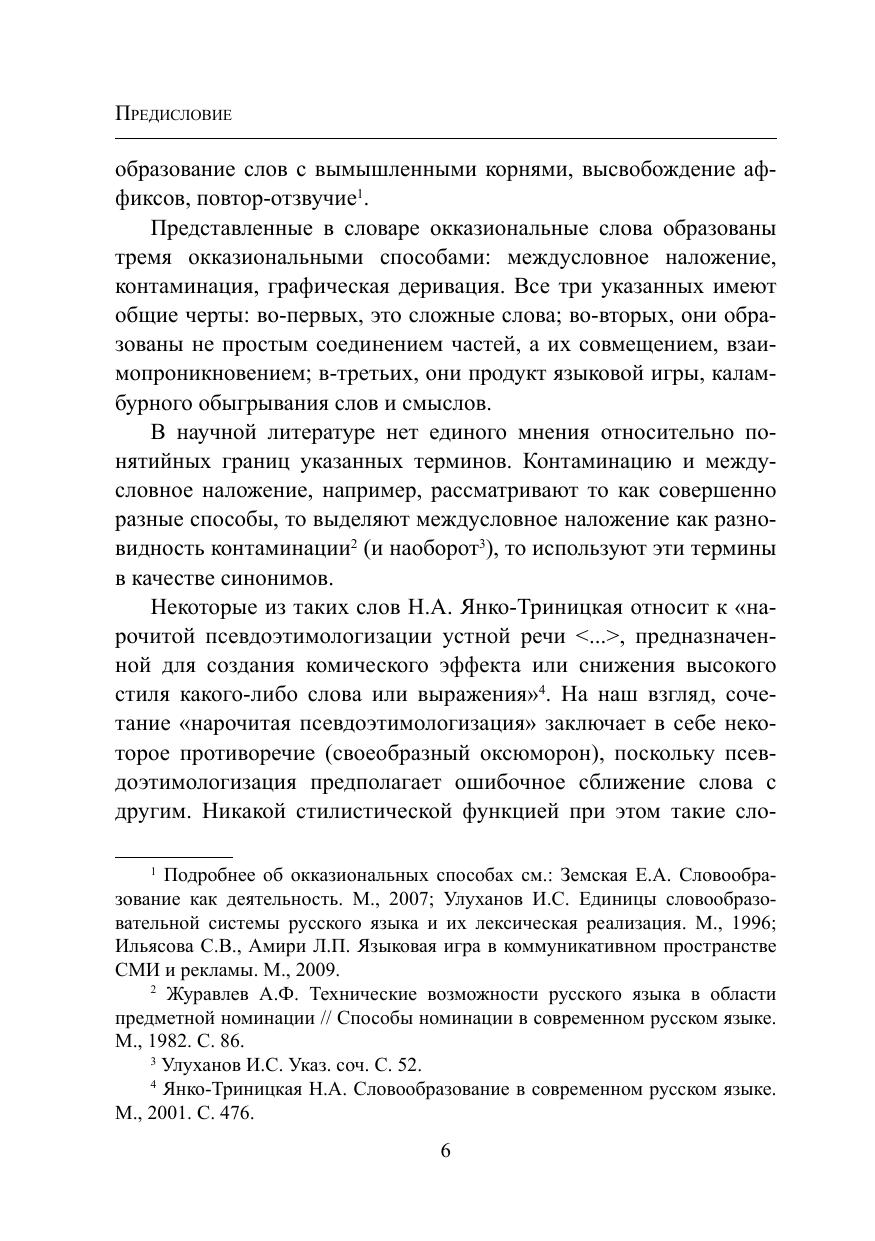 В словаре собраны слова, созданные по окказиональным моделям словообразования: контаминация, междусловное наложение, графодеривация. Слова эти объединяет игровой характер: они создавались не с целью номинации, а для привлечения внимания читателя и выражения оценки. Материал словаря отражает не только тенденции современного словообразования, но и тенденции языка: установка на игру, яркую экспрессию, оценочность. Для облегчения поиска окказионализмов в конце дан словарный указатель. Материалом для