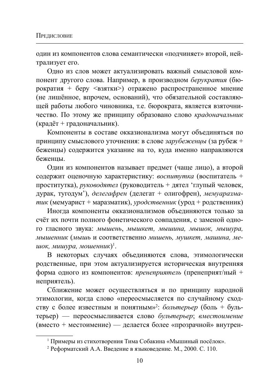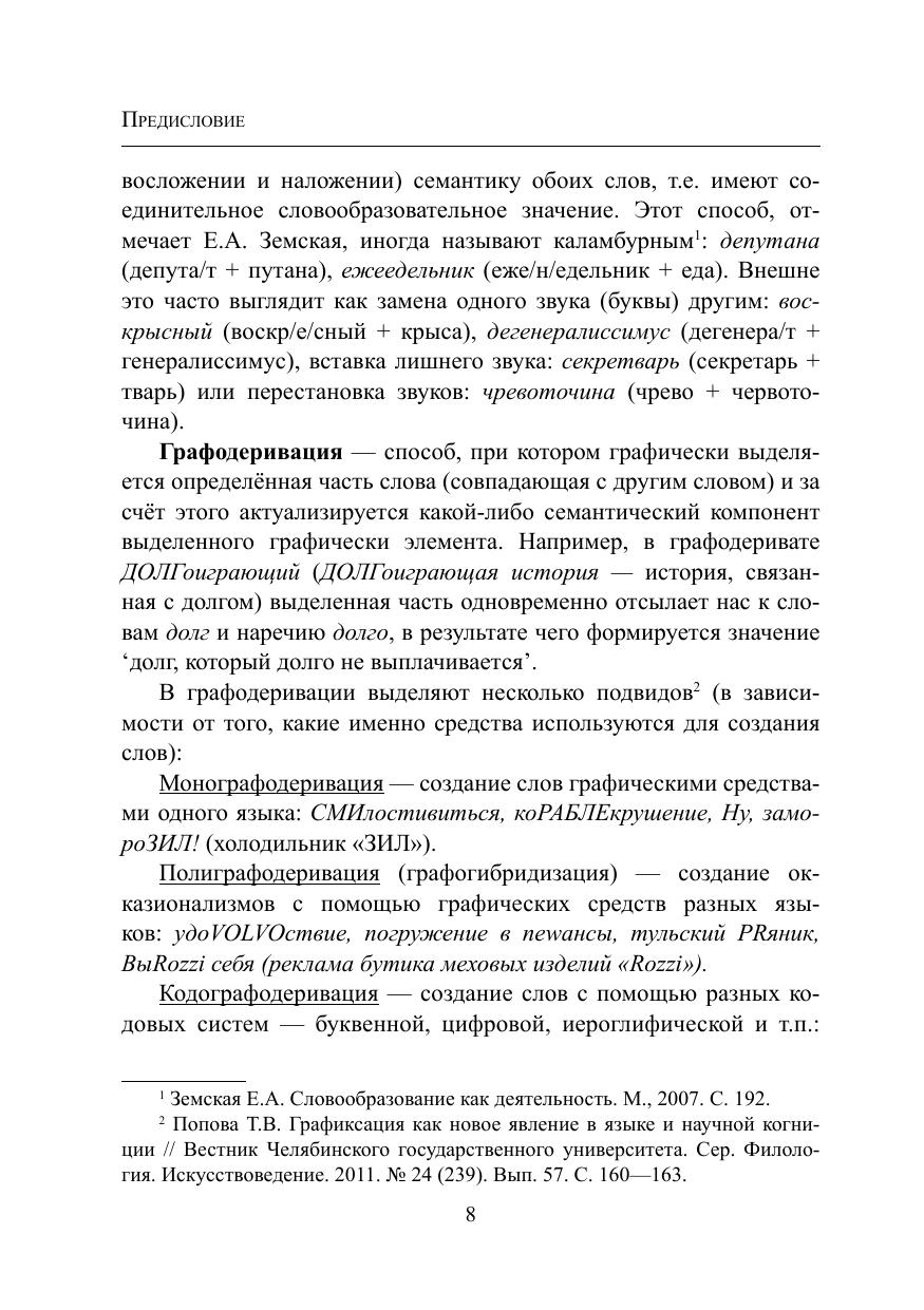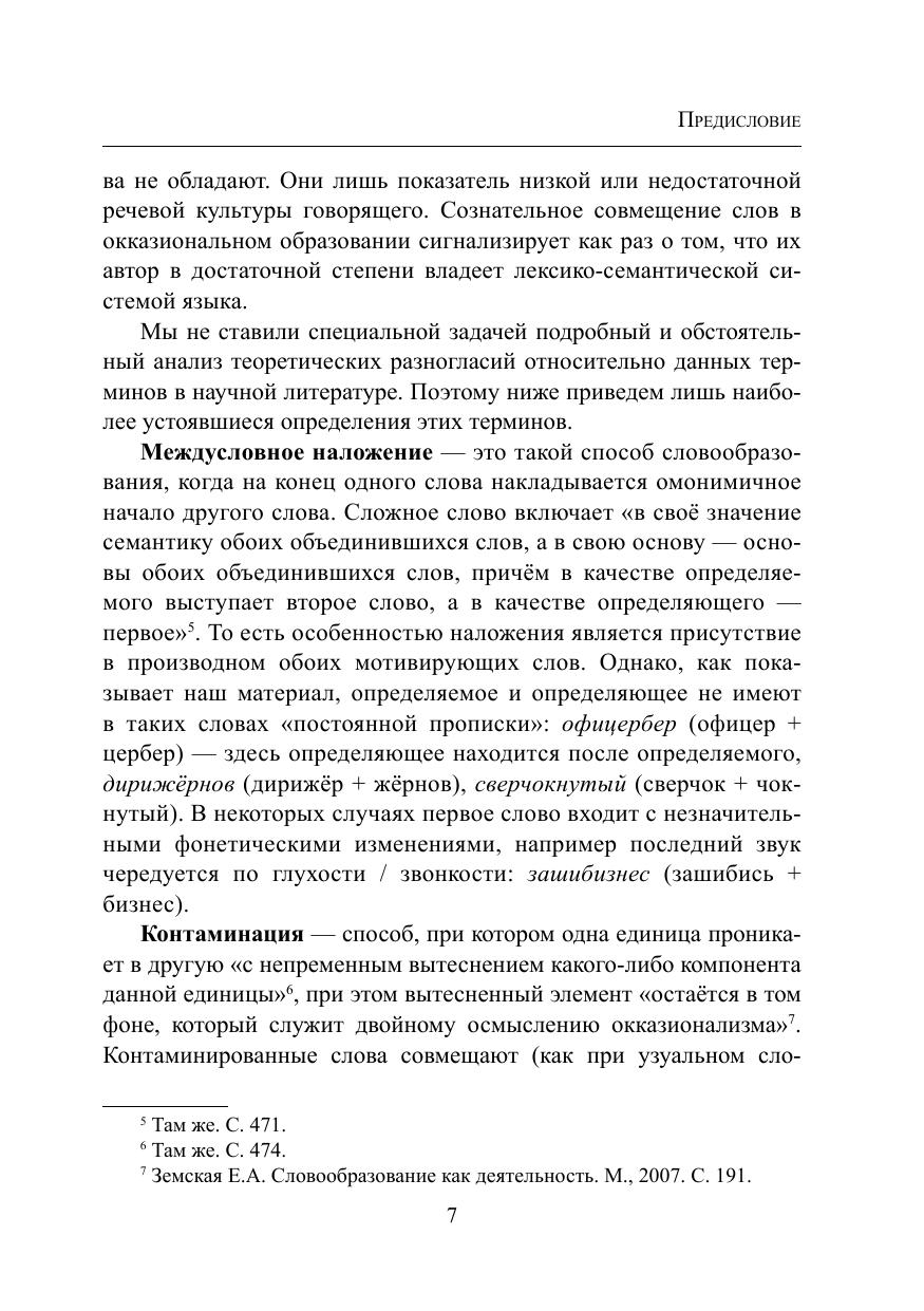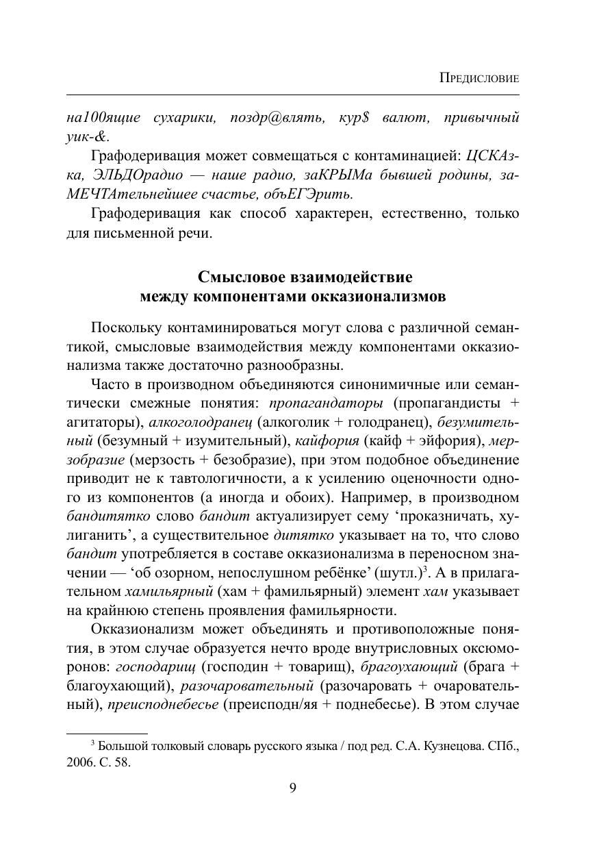 В словаре собраны слова, созданные по окказиональным моделям словообразования: контаминация, междусловное наложение, графодеривация. Слова эти объединяет игровой характер: они создавались не с целью номинации, а для привлечения внимания читателя и выражения оценки. Материал словаря отражает не только тенденции современного словообразования, но и тенденции языка: установка на игру, яркую экспрессию, оценочность. Для облегчения поиска окказионализмов в конце дан словарный указатель. Материалом для