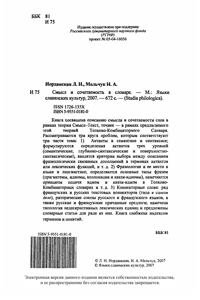 Книга посвящена описанию смысла и сочетаемости слов в рамках теории "смысл-текст", точнее - в рамках предлагаемого этой теорией толково-комбинаторного словаря. Рассматриваются три круга проблем, которым соответствуют три части тома: 1) Актанты в семантике и синтаксисе, формулируются определения актантов трех уровней (семантические, глубинно-синтаксические и поверхностно-синтаксические), вводятся критерии выбора между описанием фразеологически связанных дополнений в терминах актантов или лексических функций, и т. д. 2) Фразеология и ее место в языке и лингвистике, определяются основные типы фразем (прагматемы, идиомы, коллокации и квази-идиомы), намечаются принципы подачи идиом и квази-идиом в толково-комбинаторных словарях и т. д. 3) Коннекторные слова: ряд французских и русских текстовых коннекторов (типа в самом деле), риторические союзы русского и французского языков, а также русские и французские причинные предлоги, намечена типология недескриптивных лексических единиц и предложены словарные статьи для ряда из них. Книга снабжена индексом терминов и понятий. Для научных работников, широкого круга специалистов.