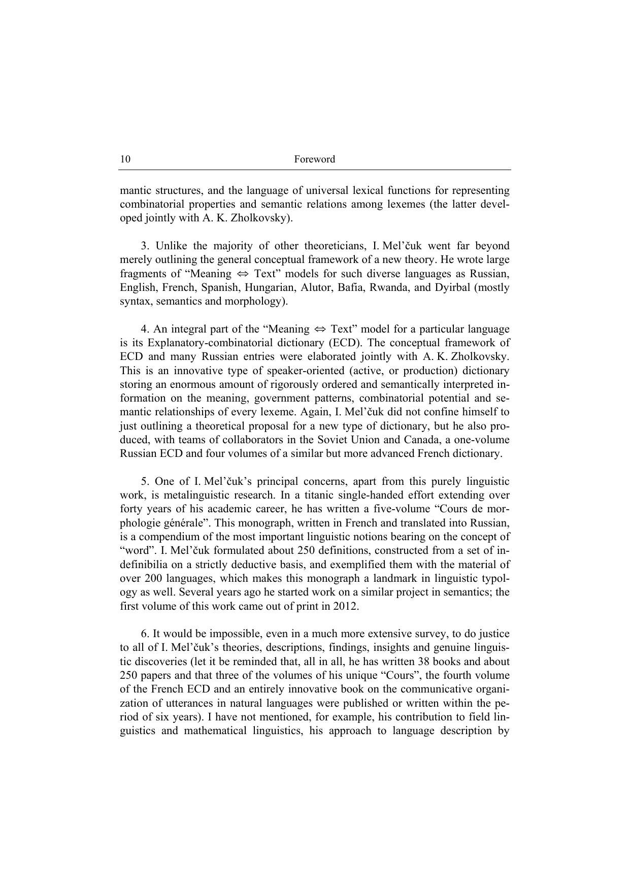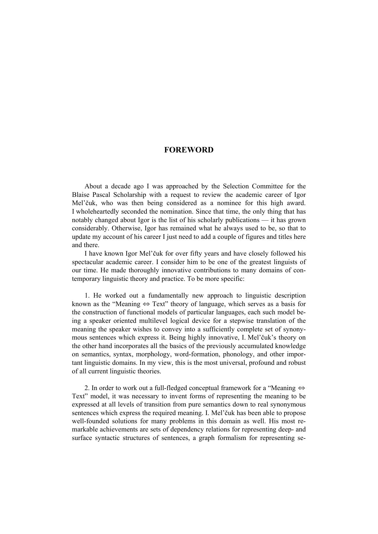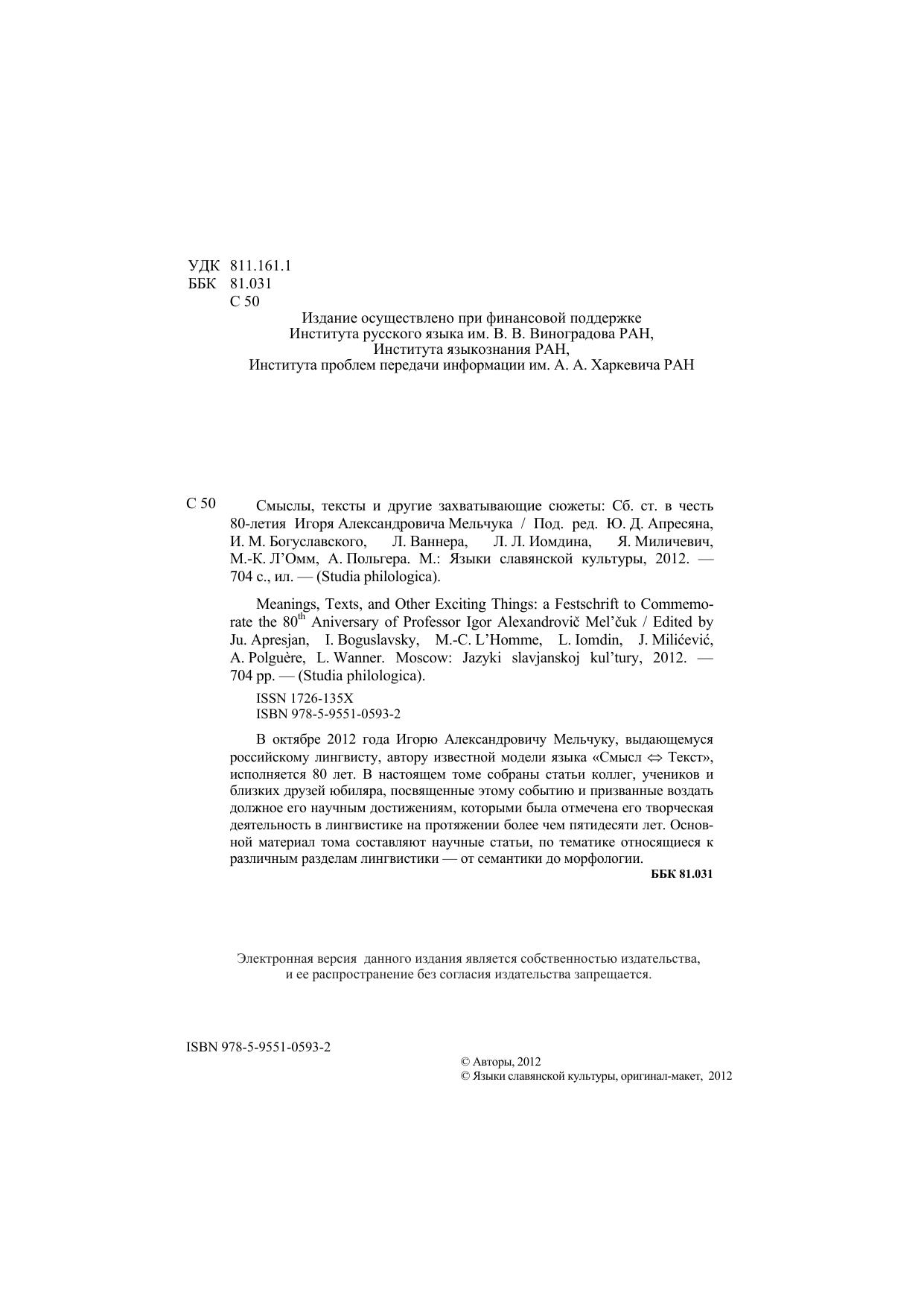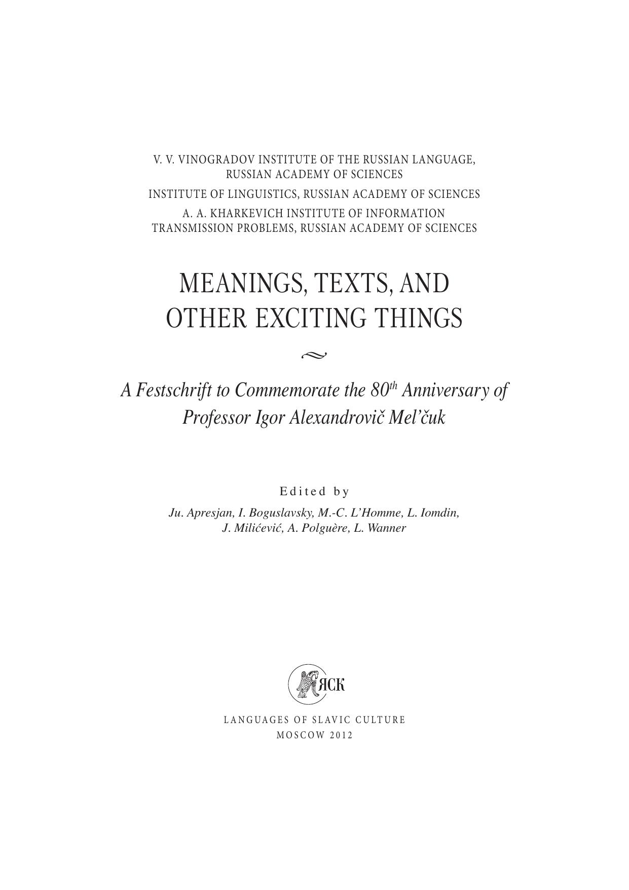 В октябре 2012 года Игорю Александровичу Мельчуку, выдающемуся российскому лингвисту, автору известной модели языка "Смысл-Текст", исполняется 80 лет. В настоящем томе собраны статьи коллег, учеников и близких друзей юбиляра, посвященные этому событию и призванные воздать должное его научным достижениям, которыми была отмечена его творческая деятельность в лингвистике на протяжение более чем пятидесяти лет, основной материал тома составляют научные статьи, по тематике относящиеся к различным разделам лингвистики - от семантики до морфологии.