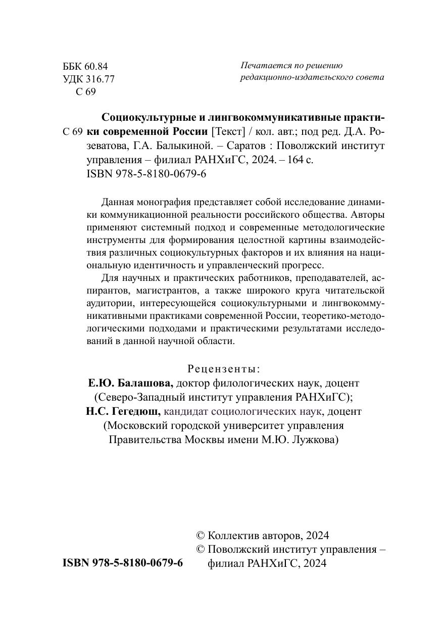 Данная монография представляет собой исследование динамики коммуникационной реальности российского общества. Авторы применяют системный подход и современные методологические инструменты для формирования целостной картины взаимодействия различных социокультурных факторов и их влияния на национальную идентичность и управленческий прогресс. Для научных и практических работников, преподавателей, аспирантов, магистрантов, а также широкого круга читательской аудитории, интересующейся социокультурными и лингвокоммуникативными практиками современной России, теоретико-методологическими подходами и практическими результатами исследований в данной научной области.