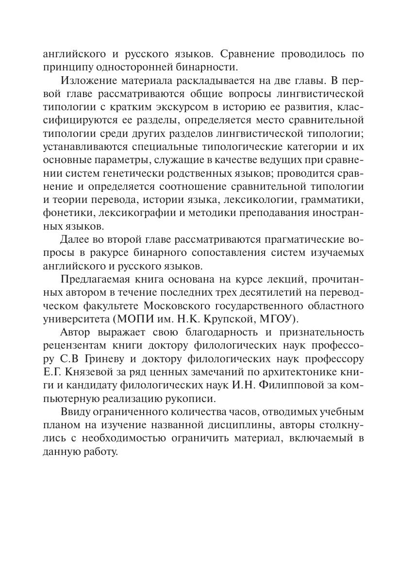 В книге рассматриваются общие вопросы лингвистической типологии с кратким экскурсом в историю ее становления и развития, классификации ее разделов, определяется место сравнительной типологии среди других разделов лингвистической типологии, устанавливаются специальные типологические категории и их основные параметры, проводится сравнение и определяется соотношение типологии и теории перевода, типологии и лексикографии, типологии и методики (лингводидактики), предлагается бинарное сопоставление и сравнение систем английского и русского языков.