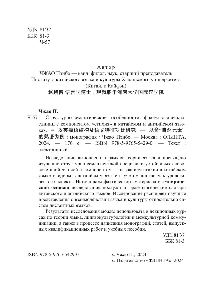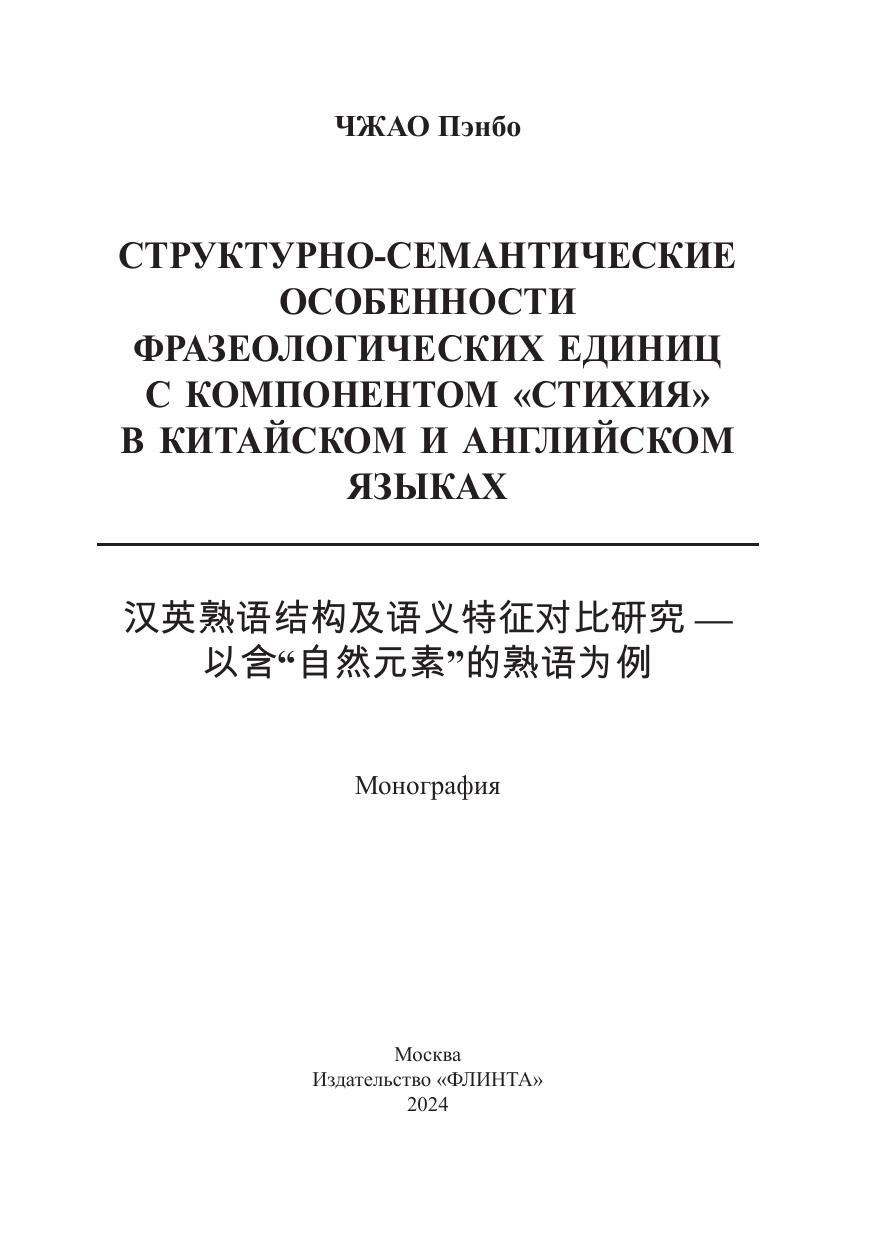 Структурно-семантические особенности фразеологических единиц с компонентом «стихия» в китайском и английском языках. 汉英熟语结构及语义特征对比研究 — 以含“自然元素”的熟语为例)