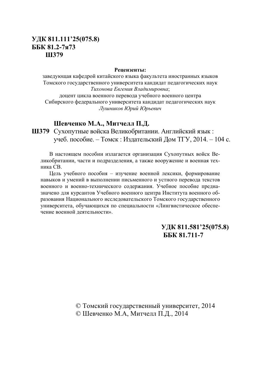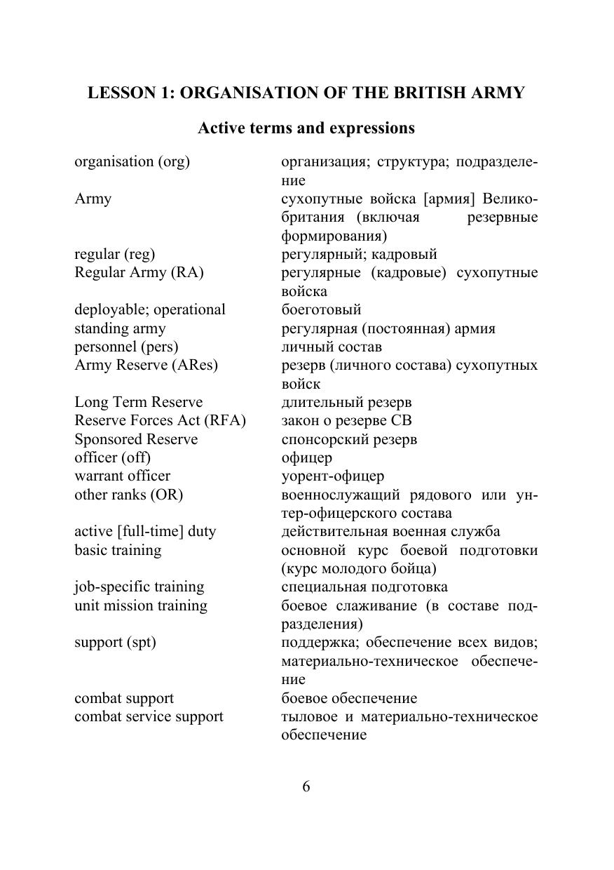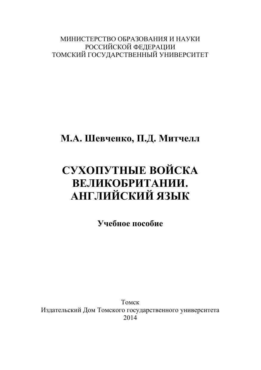 В настоящем пособии излагается организация Сухопутных войск Великобритании, части и подразделения, а также вооружение и военная техника СВ. Цель учебного пособия – изучение военной лексики, формирование навыков и умений в выполнении письменного и устного перевода текстов военного и военно-технического содержания. Учебное пособие предназначено для курсантов Учебного военного центра Института военного образования Национального исследовательского Томского государственного университета, обучающихся по специальности «Лингвистическое обеспечение военной деятельности».