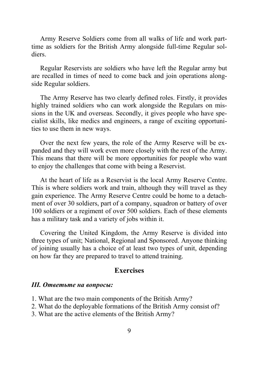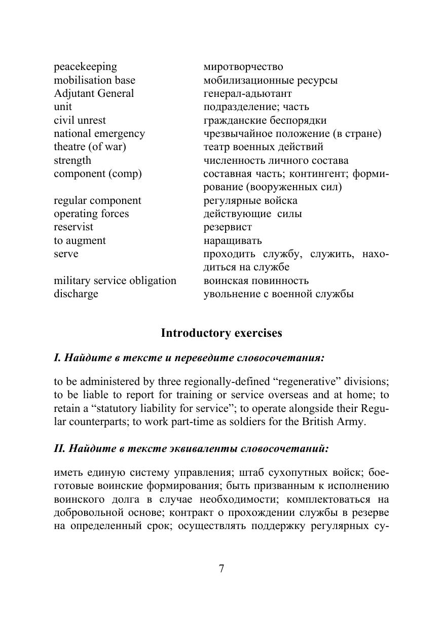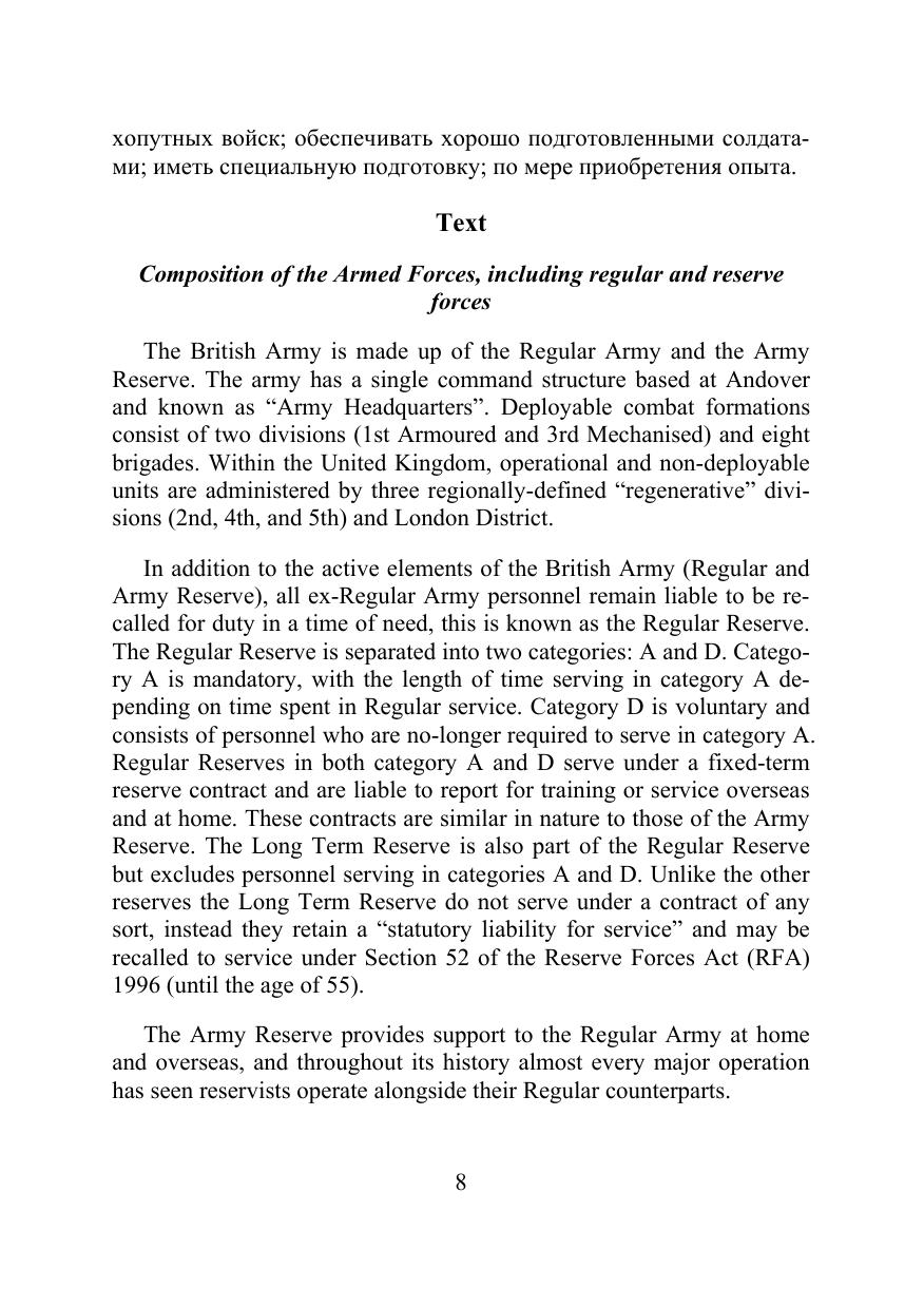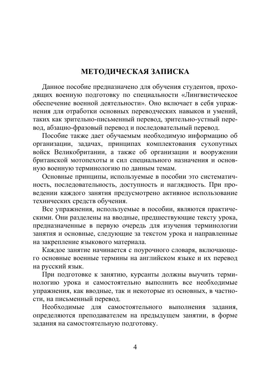 В настоящем пособии излагается организация Сухопутных войск Великобритании, части и подразделения, а также вооружение и военная техника СВ. Цель учебного пособия – изучение военной лексики, формирование навыков и умений в выполнении письменного и устного перевода текстов военного и военно-технического содержания. Учебное пособие предназначено для курсантов Учебного военного центра Института военного образования Национального исследовательского Томского государственного университета, обучающихся по специальности «Лингвистическое обеспечение военной деятельности».