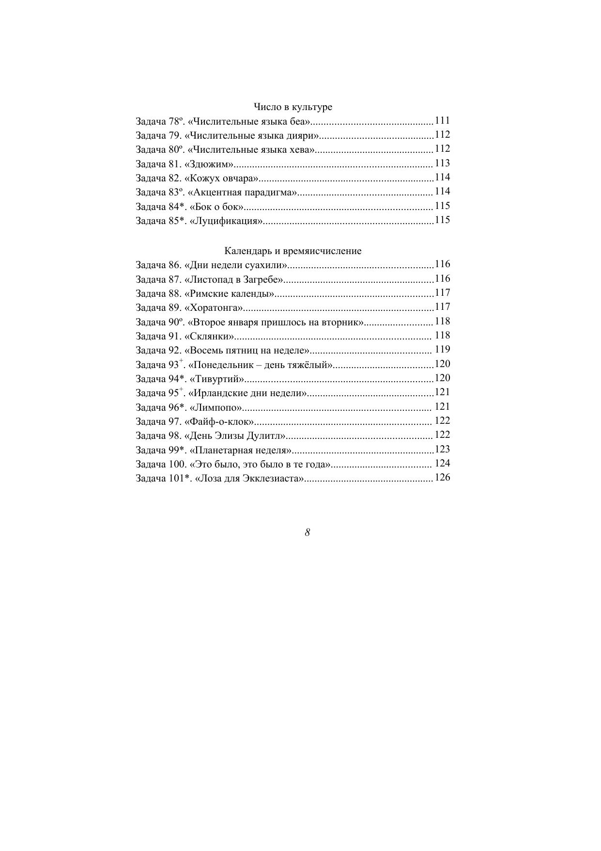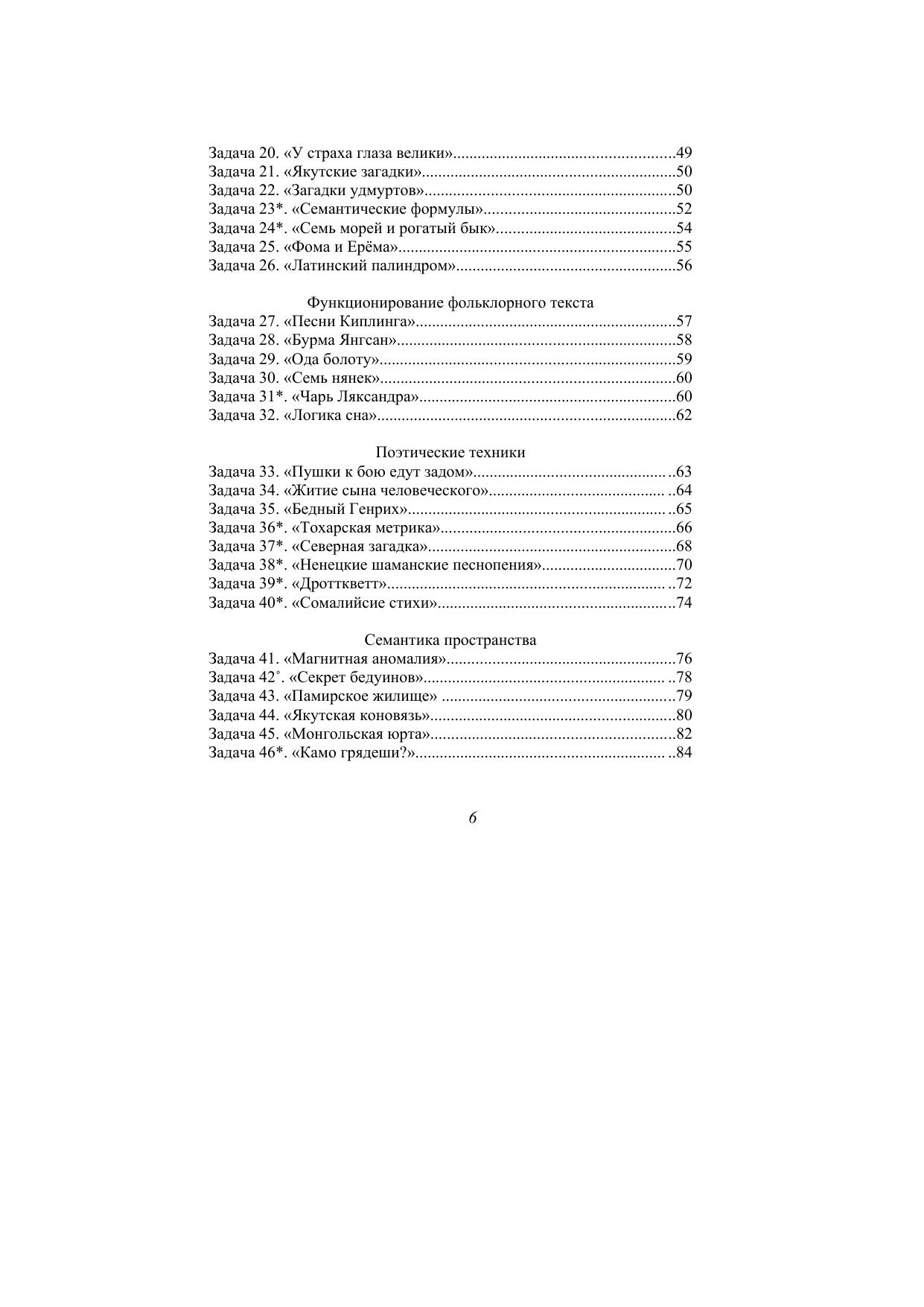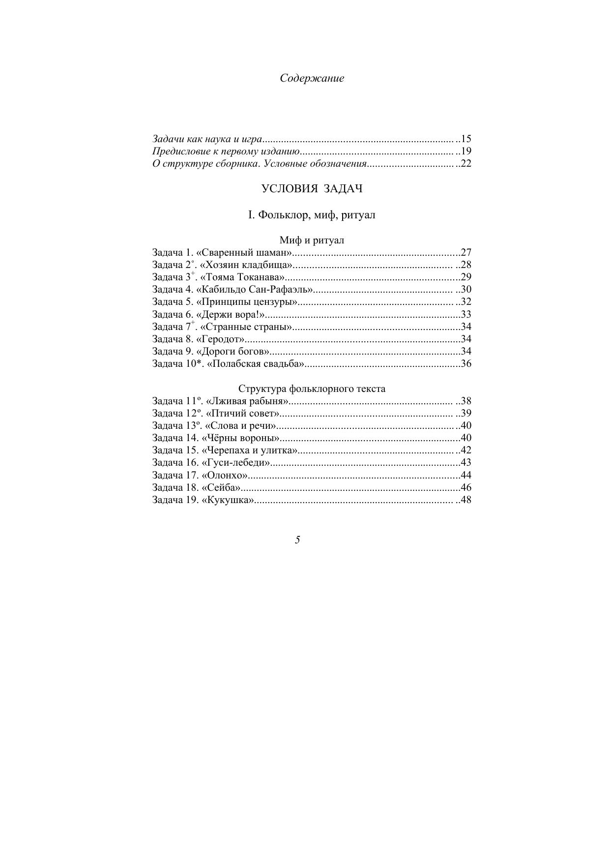 Книга включает в себя 128 задач (с решениями), подобранных по темам: «Миф и ритуал», «Структура фольклорного текста», «Функционирование фольклорного текста», «Семантика пространства», «Системы именования», «Календарь и времяисчисление», «Язык и общество» и т.д. Сборник демонстрирует системный подход к изучению многообразного фольклорного материала, рассматриваемого в различных аспектах (с точки зрения структуры общества, внутренней структуры языка, типологии текстов). В отечественной фольклористике это первый опыт такого рода, раньше существовали лишь сборники лингвистических задач.