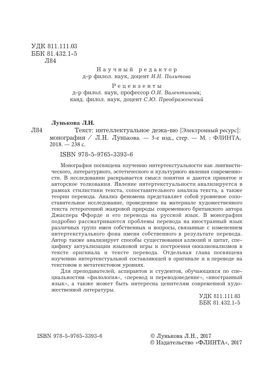 Монография посвящена изучению интертекстуальности как лингвистического, литературного, эстетического и культурного явления современности. В исследовании раскрывается смысл понятия и даются принятое и авторское толкования. Явление интертекстуальности анализируется в рамках стилистики текста, сопоставительного анализа текста, а также теории перевода. Анализ феномена представляет собой уровневое сопоставительное исследование, проведенное на материале художественного текста гетерогенной жанровой природы современного британского автора Джаспера Ффорде и его перевода на русской язык. В монографии подробно рассматриваются проблемы перевода на иностранный язык различных групп имен собственных и вопросы, связанные с изменением интертекстуального фона имени собственного в результате перевода.