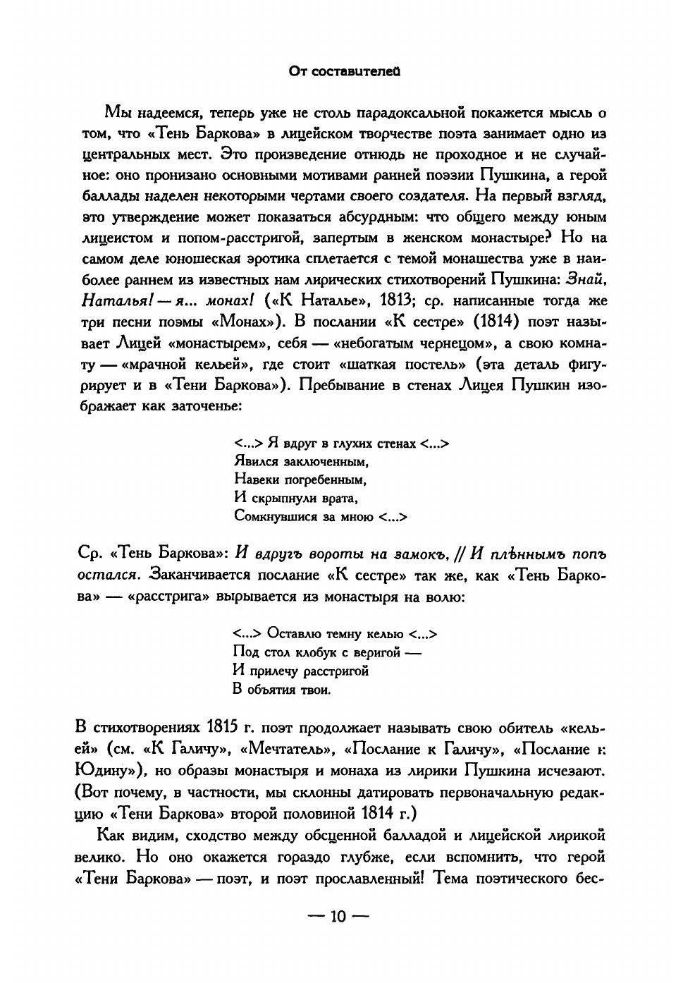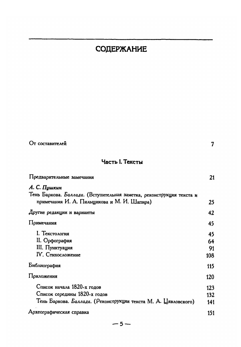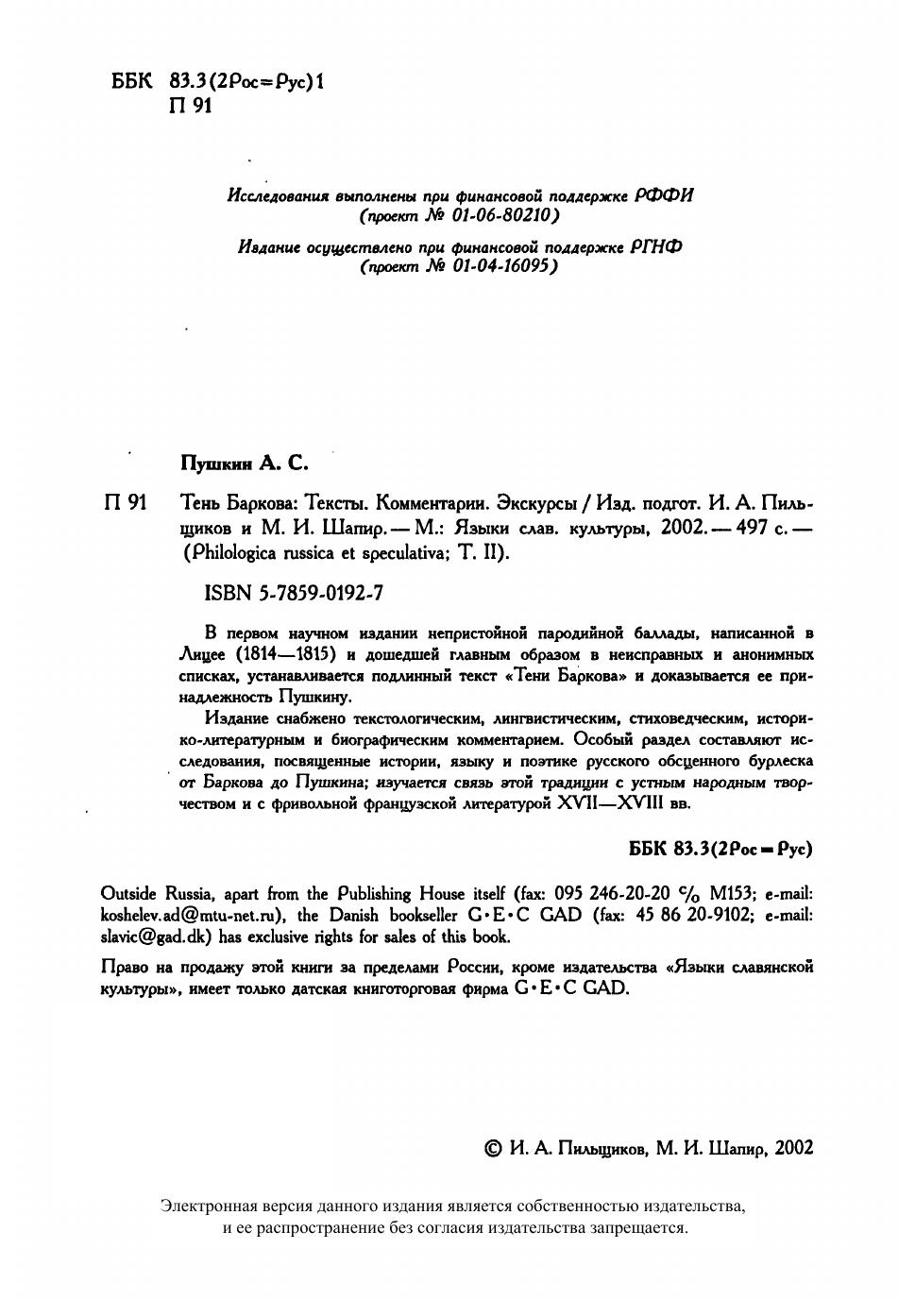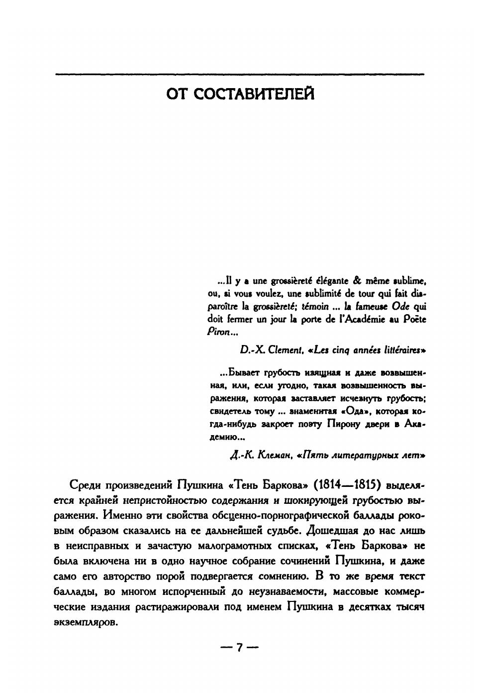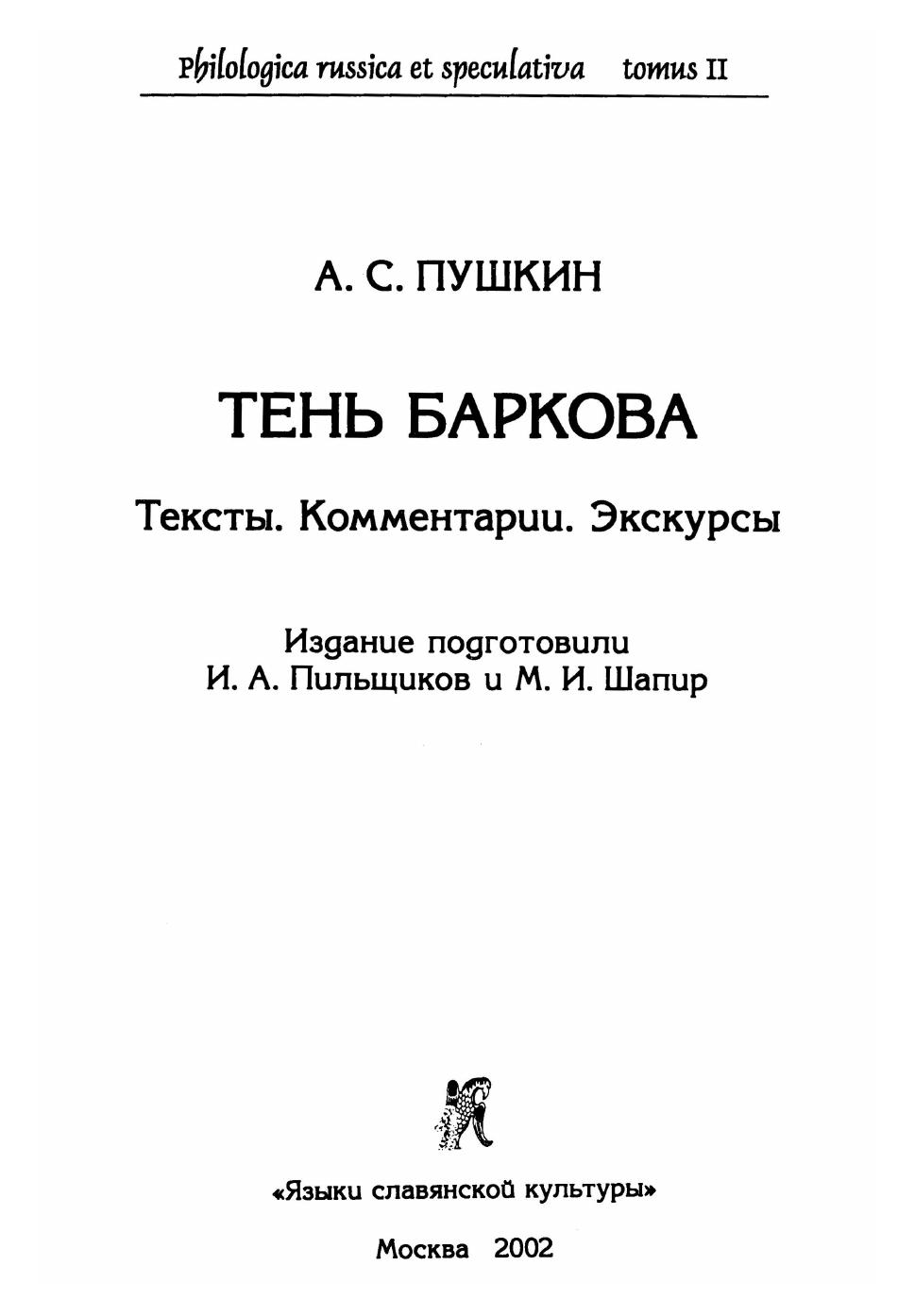 В первом научном издании непристойной пародийной баллады, написанной в Лицее (1814—1815) и дошедшей главным образом в неисправных и анонимных списках, устанавливается подлинный текст «Тени Баркова» и доказывается ее принадлежность Пушкину. Издание снабжено текстологическим, лингвистическим, стиховедческим, историко-литературным и биографическим комментарием. Особый раздел составляют исследования, посвященные истории, языку и поэтике русского обсценного бурлеска от Баркова до Пушкина, изучается связь этой традиции с устным народным творчеством и с фривольной французской литературой XVII—XVIII вв.