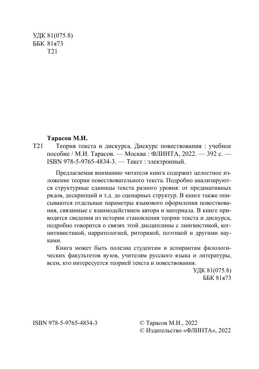 Предлагаемая вниманию читателя книга содержит целостное изложение теории повествовательного текста. Подробно анализируются структурные единицы текста разного уровня: от предикативных рядов, дескрипций и т.д. до сценарных структур. В книге также описываются отдельные параметры языкового оформления повествования, связанные с взаимодействием автора и материала. В книге приводятся сведения из истории становления теории текста и дискурса, подробно говорится о связях этой дисциплины с лингвистикой, когнитивистикой, нарратологией, риторикой, поэтикой и другими науками.
