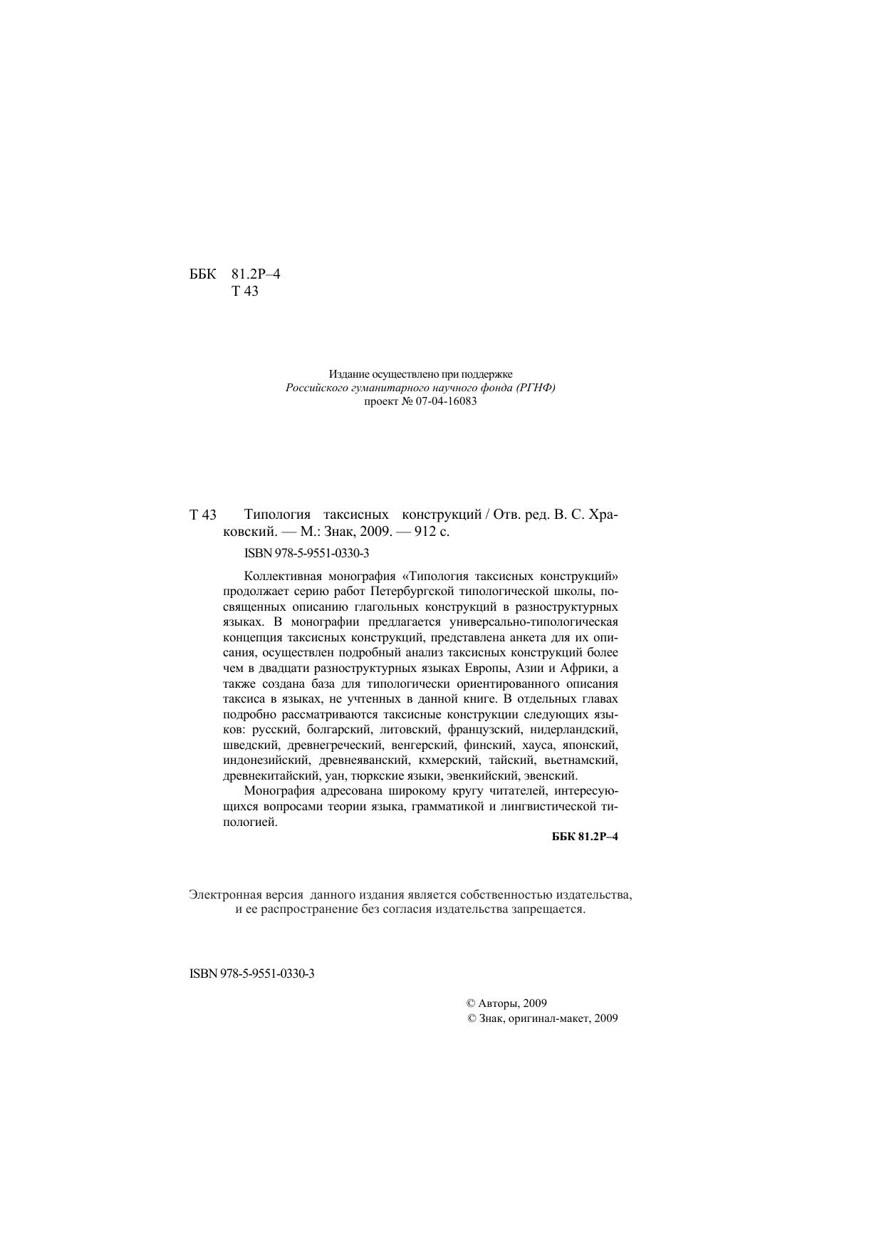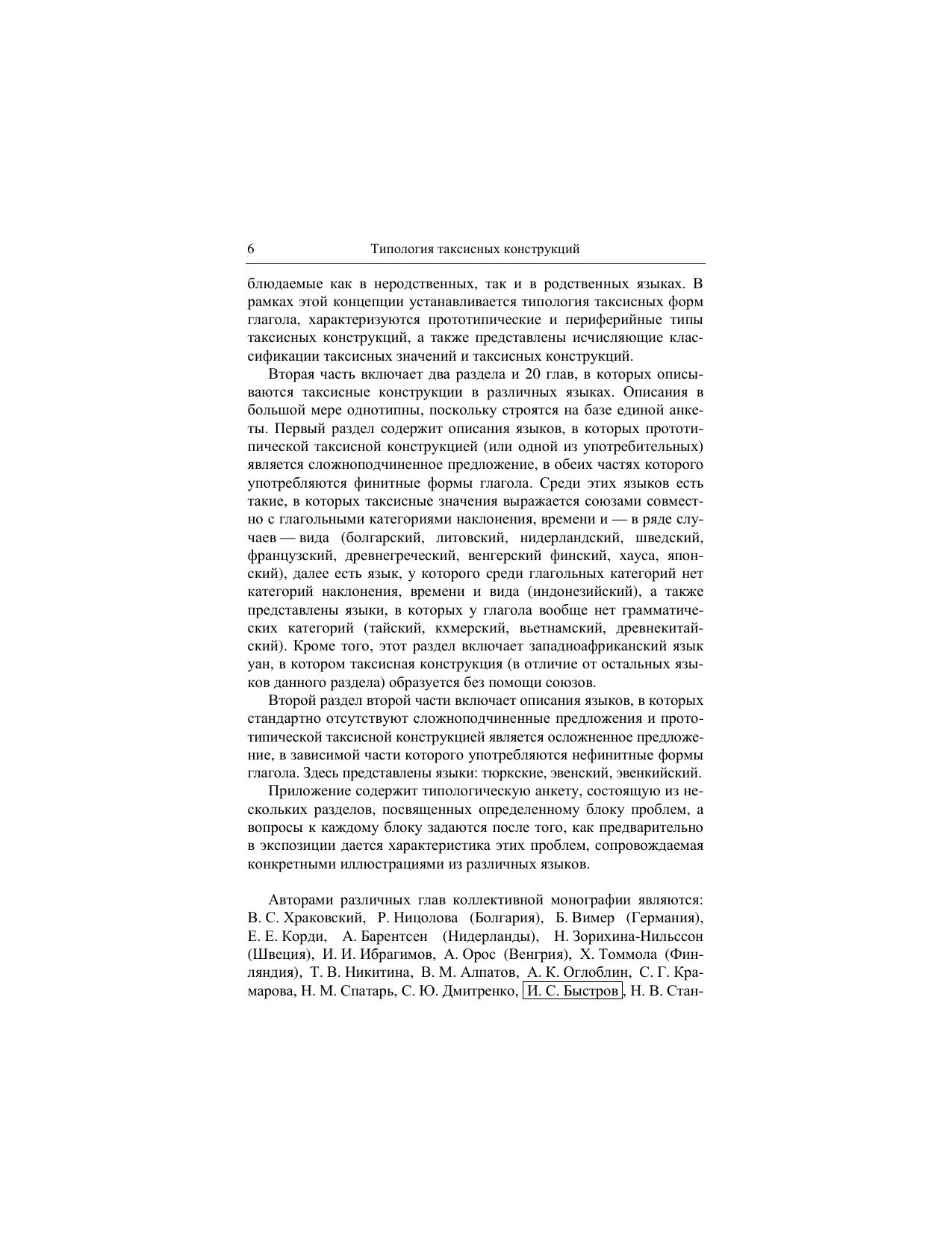 Коллективная монография «Типология таксисных конструкций» продолжает серию работ Петербургской типологической школы, посвященных описанию глагольных конструкций в разноструктурных языках. В монографии предлагается универсально-типологическая концепция таксисных конструкций, представлена анкета для их описания, осуществлен подробный анализ таксисных конструкций более чем в двадцати разноструктурных языках Европы, Азии и Африки, а также создана база для типологически ориентированного описания таксиса в языках, не учтенных в данной книге. В отдельных главах подробно рассматриваются таксисные конструкции следующих языков: русский, болгарский, литовский, французский, нидерландский, шведский, древнегреческий, венгерский, финский, хауса, японский, индонезийский, древнеяванский, кхмерский, тайский, вьетнамский, древнекитайский, уан, тюркские языки, эвенкийский, эвенский. Монография адресована широкому кругу читателей, интересующихся вопросами теории языка, грамматикой и лингвистической типологией.