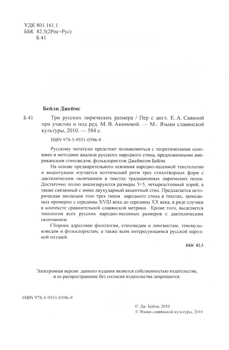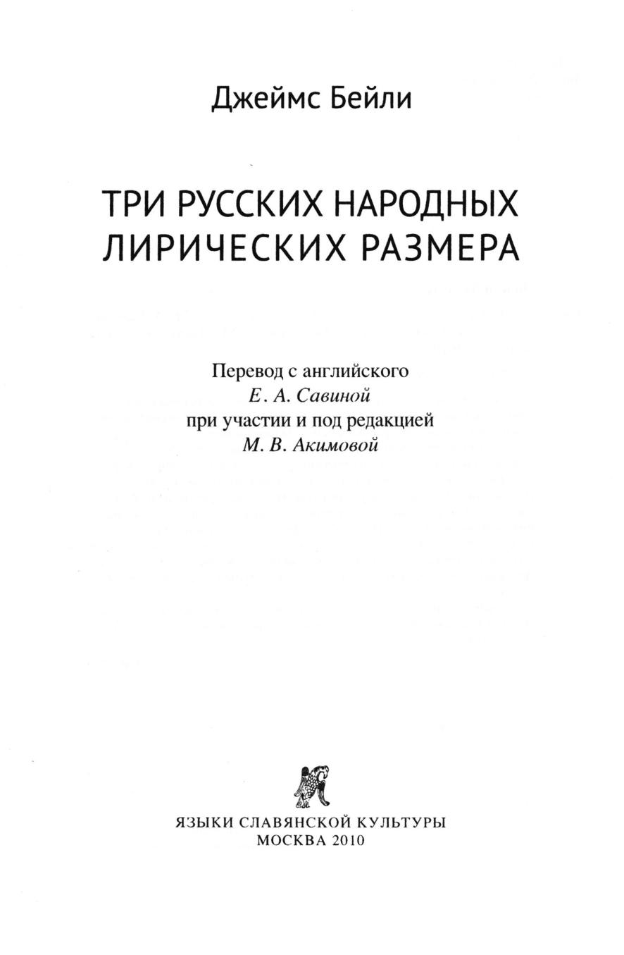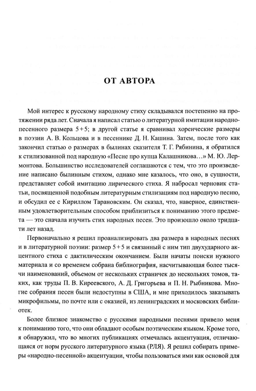Русскому читателю предстоит познакомиться с теоретическими основами и методами анализа русского народного стиха, предложенными американским стиховедом, фольклористом Джеймсом Бейли. На основе предварительного освоения народно-песенной текстологии и акцентуации изучается поэтический ритм трех стихотворных форм с дактилическим окончанием в текстах традиционных лирических песен. Достаточно полно анализируются размеры 5+5, четырехстопный хорей, а также связанный с ними двухударный акцентный стих. Предлагается историческая эволюция этих трех типов народного стиха в текстах, записанных примерно с середины XVIII века до середины XX века, в ряде случаев в контексте сравнительной славянской метрики. Кроме того, выделяется типология всех русских народно-песенных размеров с дактилическим окончанием. Сборник адресован филологам, стиховедам и лингвистам, этномузыковедам и фольклористам, а также всем интересующимся русской народной поэзией.