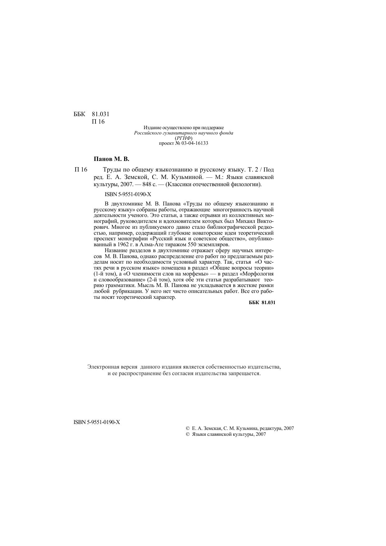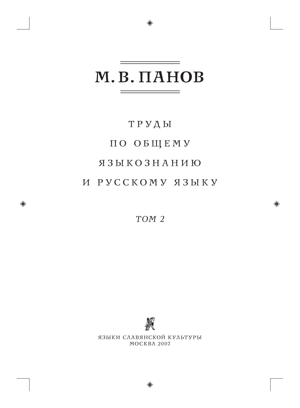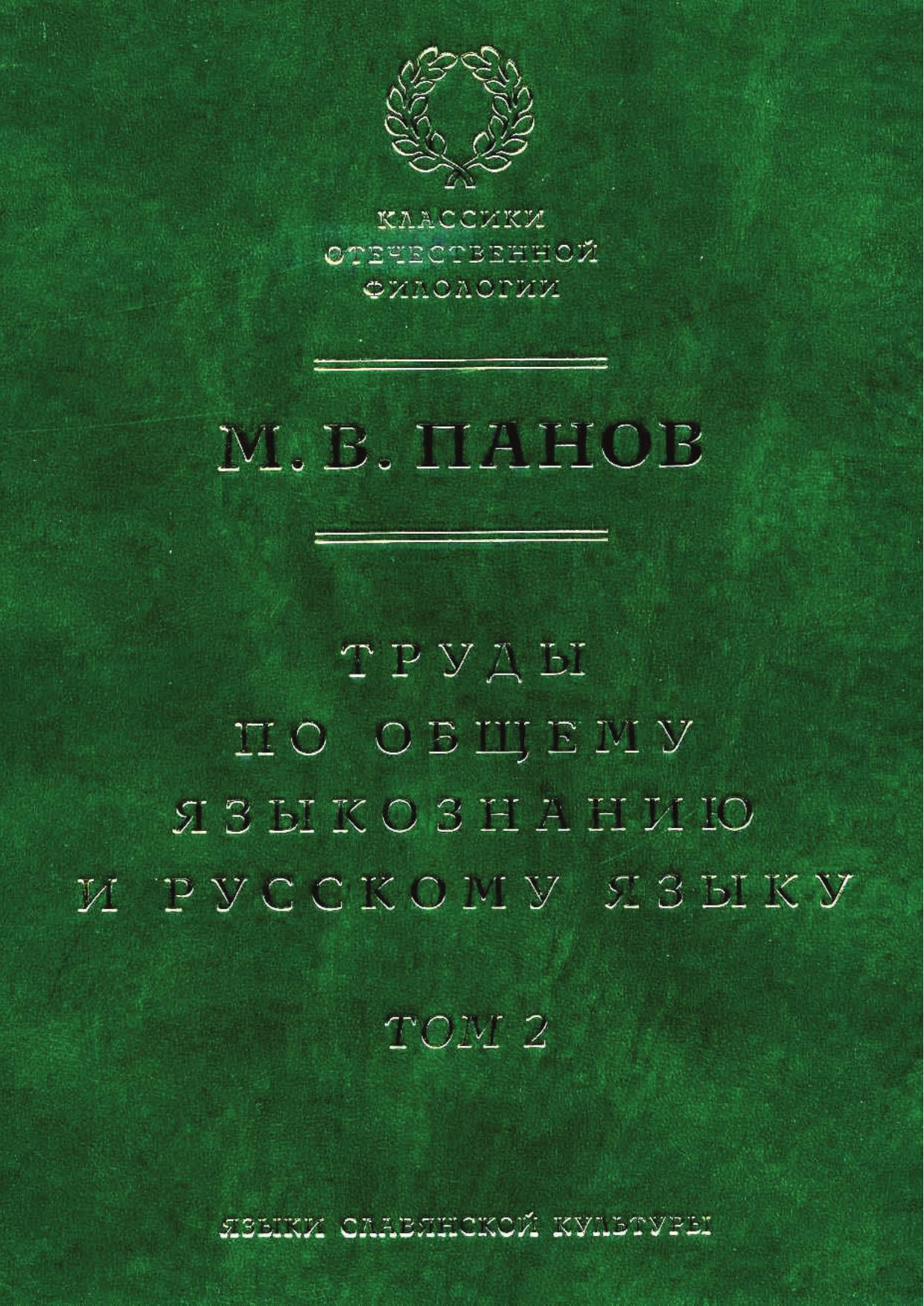 В двухтомнике М.В.Панова "Труды по общему языкознанию и русскому языку" собраны работы, отражающие многогранность научной деятельности ученого. Это статьи, а также отрывки из коллективных монографий, руководителем и вдохновителем которых был Михаил Викторович. Многое из публикуемого давно стало библиографической редкостью, например, содержащий глубокие новаторские идеи теоретический проспект монографии "Русский язык и советское общество", опубликованный в 1962 г. в Алма-Ате тиражом 550 экземпляров. .Название разделов в двухтомнике отражает сферу научных интересов М.В.Панова, однако распределение его работ по предлагаемым разделам носит по необходимости условный характер. Так, статья "О частях речи в русском языке" помещена в раздел "Общие вопросы теории" (1-й том), а "О грамматической форме" - в раздел "Морфология и словообразование" (2-й том), хотя обе эти статьи разрабатывают теорию грамматики. Мысль М.В.Панова не укладывается в жесткие рамки любой рубрикации. У него нет чисто описательных работ. Все его работы носят теоретический характер.