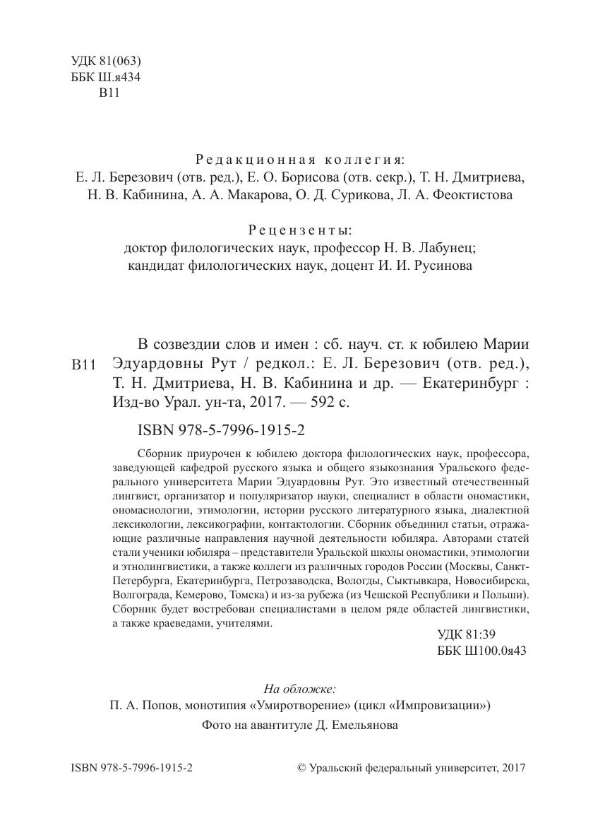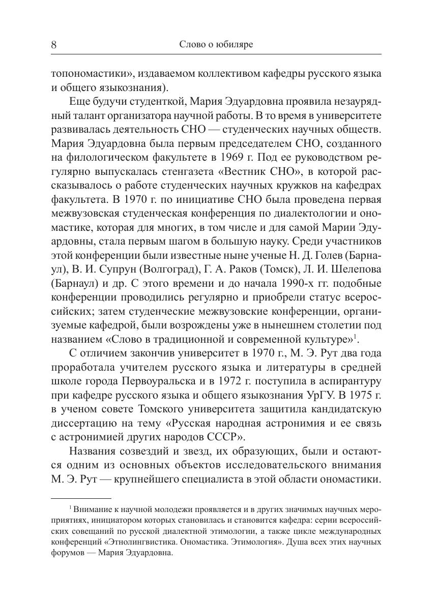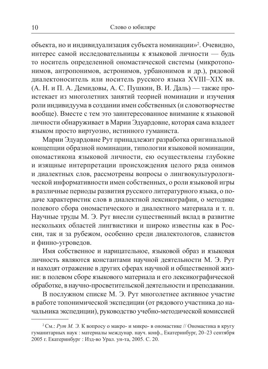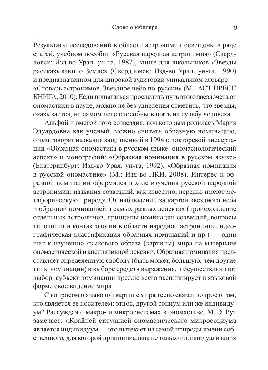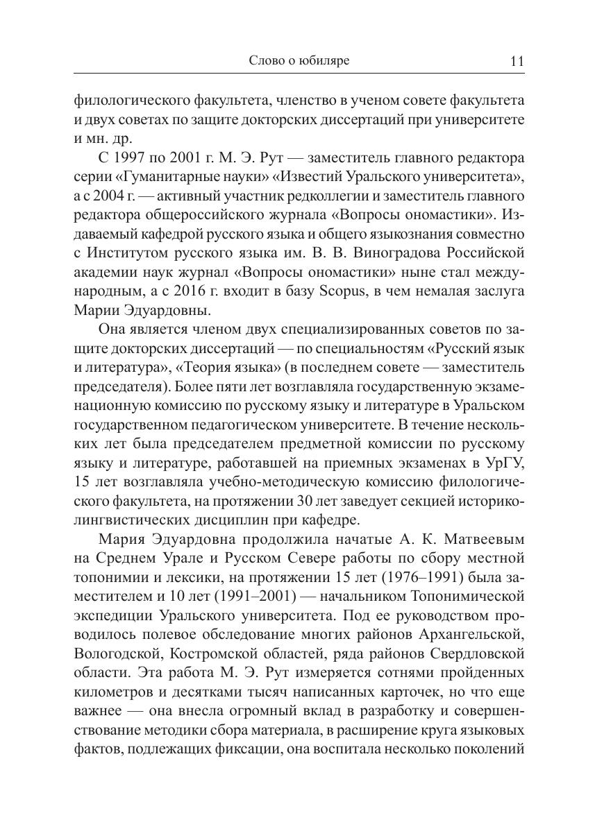 Сборник приурочен к юбилею доктора филологических наук, профессора, заведующей кафедрой русского языка и общего языкознания Уральского федерального университета Марии Эдуардовны Рут. Это известный отечественный лингвист, организатор и популяризатор науки, специалист в области ономастики, ономасиологии, этимологии, истории русского литературного языка, диалектной лексикологии, лексикографии, контактологии. Сборник объединил статьи, отражающие различные направления научной деятельности юбиляра. Авторами статей стали ученики юбиляра – представители Уральской школы ономастики, этимологии и этнолингвистики, а также коллеги из различных городов России (Москвы, СанктПетербурга, Екатеринбурга, Петрозаводска, Вологды, Сыктывкара, Новосибирска, Волгограда, Кемерово, Томска) и из-за рубежа (из Чешской Республики и Польши). Сборник будет востребован специалистами в целом ряде областей лингвистики, а также краеведами, учителями.