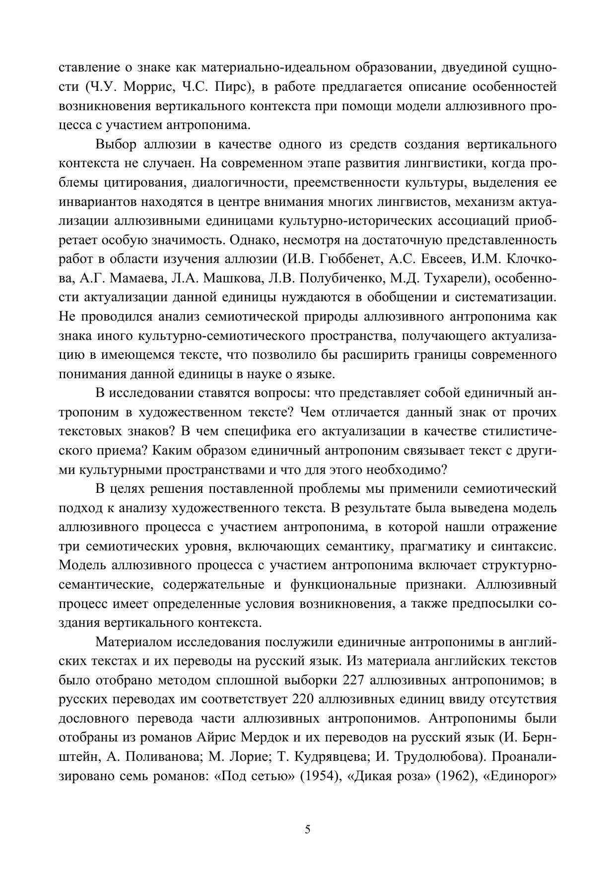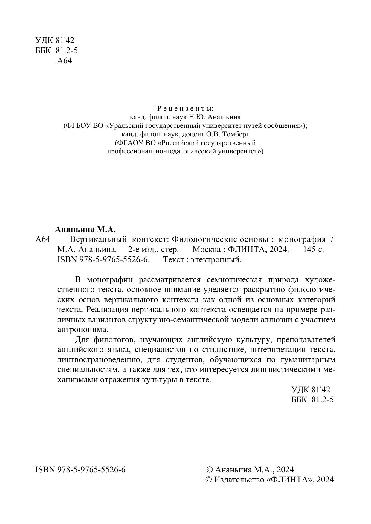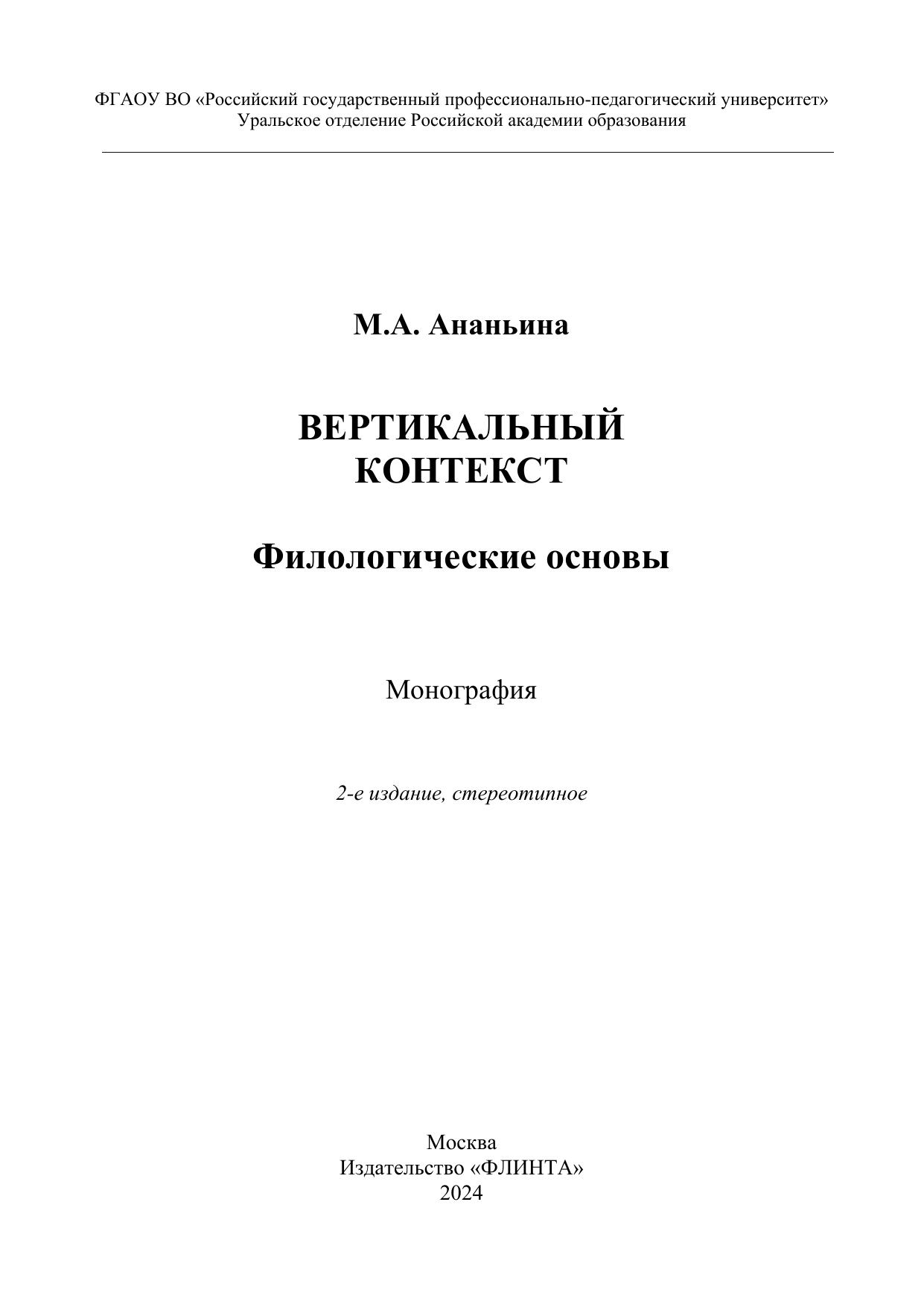 В монографии рассматривается семиотическая природа художественного текста, основное внимание уделяется раскрытию филологических основ вертикального контекста как одной из основных категорий текста. Реализация вертикального контекста освещается на примере различных вариантов структурно-семантической модели аллюзии с участием антропонима.