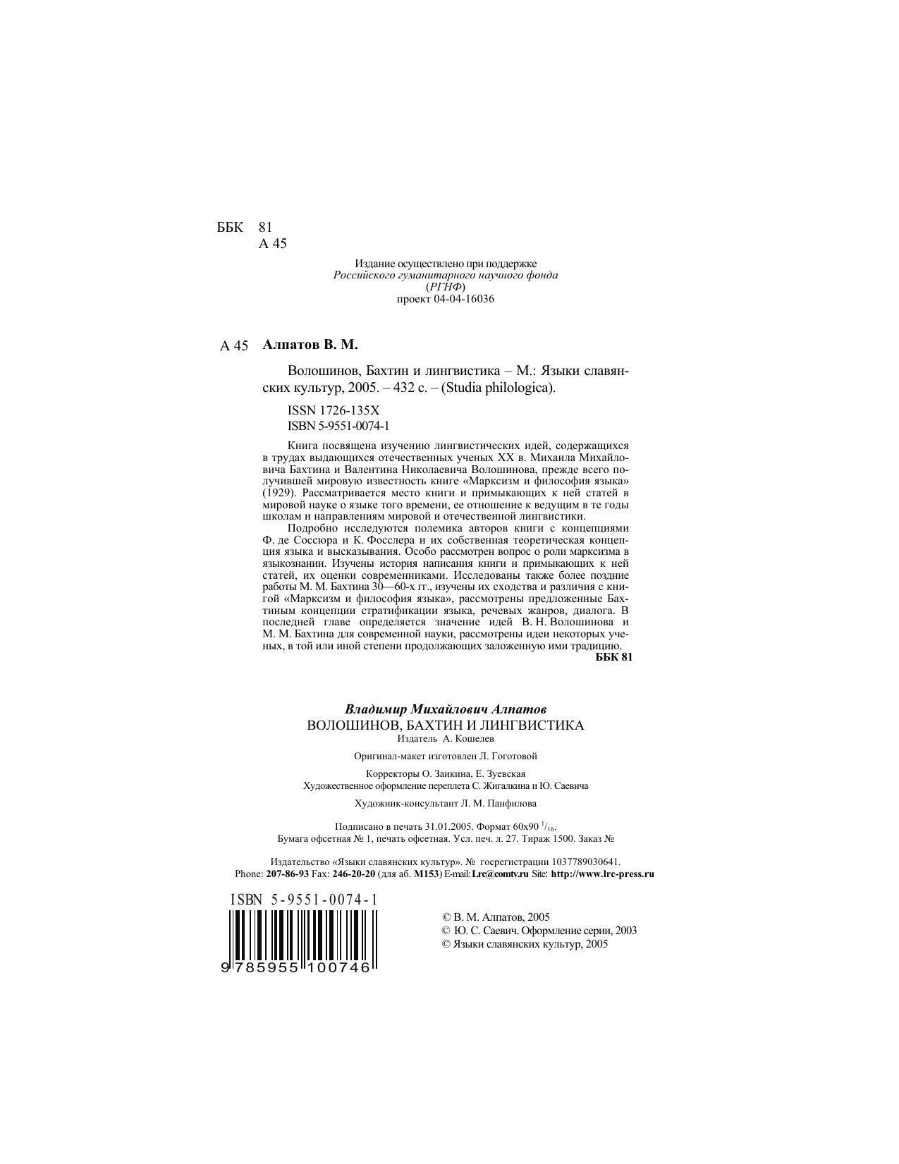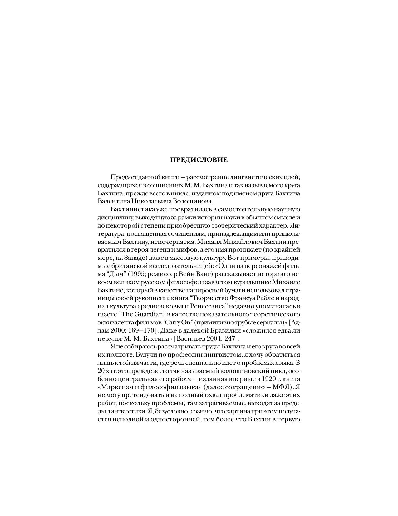 Книга посвящена изучению лингвистических идей, содержащихся в трудах выдающихся отечественных ученых ХХ в. Михаила Михайловича Бахтина и Валентина Николаевича Волошинова, прежде всего получившей мировую известность книге «Марксизм и философия языка» (1929). Рассматривается место книги и примыкающих к ней статей в мировой науке о языке того времени, ее отношение к ведущим в те годы школам и направлениям мировой и отечественной лингвистики. Подробно исследуются полемика авторов книги с концепциями Ф. де Соссюра и К. Фосслера и их собственная теоретическая концепция языка и высказывания. Особо рассмотрен вопрос о роли марксизма в языкознании. Изучены история написания книги и примыкающих к ней статей, их оценки современниками. Исследованы также более поздние работы М. М. Бахтина 30—60-х гг., изучены их сходства и различия с книгой «Марксизм и философия языка», рассмотрены предложенные Бахтиным концепции стратификации языка, речевых жанров, диалога. В последней главе определяется значение идей В. Н. Волошинова и М. М. Бахтина для современной науки, рассмотрены идеи некоторых ученых, в той или иной степени продолжающих заложенную ими традицию.