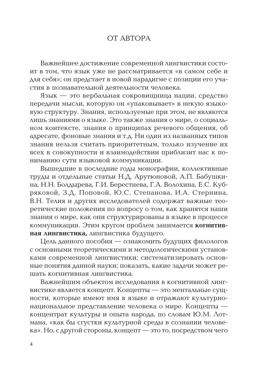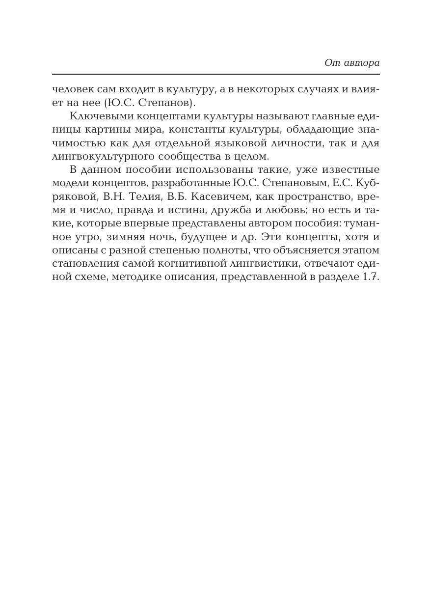 Книга содержит актуальные знания по когнитивной лингвистике — направлению науки, родившемуся на рубеже тысячелетий. Важнейшим объектом исследования в когнитивной лингвистике является концепт. Это ментальная сущность, которая имеет имя в языке и отражает культурно-национальное представление человека о действительности. В пособии представлены категории культуры, которые заложены в концептах: пространство, время и число, правда и истина, дружба и радость и др. Для студентов, аспирантов, преподавателей филологических факультетов вузов, а также представителей других гуманитарных специальностей.