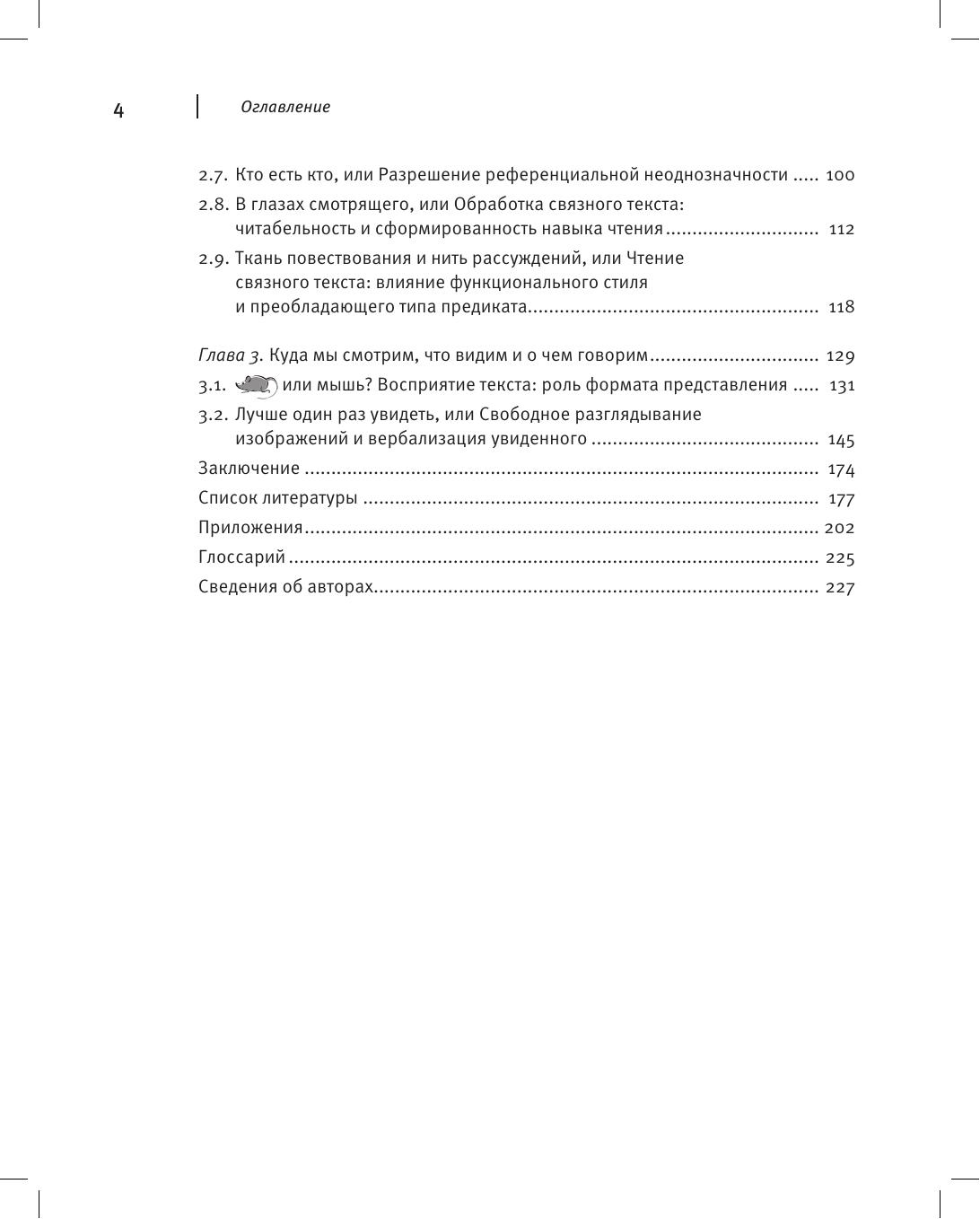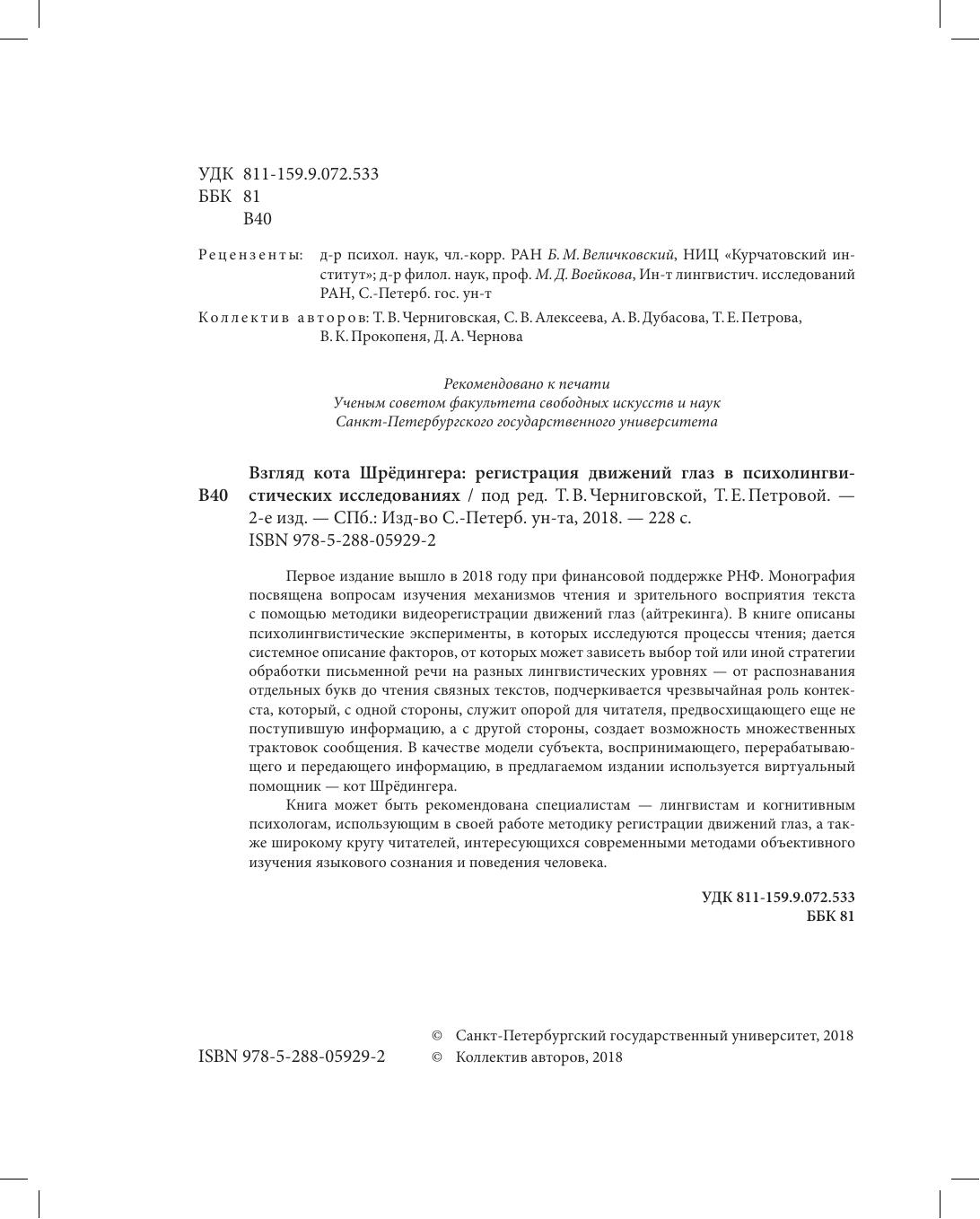 психолингвистические эксперименты, в которых исследуются процессы чтения; дается системное описание факторов, от которых может зависеть выбор той или иной стратегии обработки письменной речи на разных лингвистических уровнях — от распознавания отдельных букв до чтения связных текстов, подчеркивается чрезвычайная роль контекста, который, с одной стороны, служит опорой для читателя, предвосхищающего еще не поступившую информацию, а с другой стороны, создает возможность множественных трактовок сообщения. В качестве модели субъекта, воспринимающего, перерабатывающего и передающего информацию, в предлагаемом издании используется виртуальный помощник — кот Шрёдингера. Книга может быть рекомендована специалистам — лингвистам и когнитивным психологам, использующим в своей работе методику регистрации движений глаз, а также широкому кругу читателей, интересующихся современными методами объективного изучения