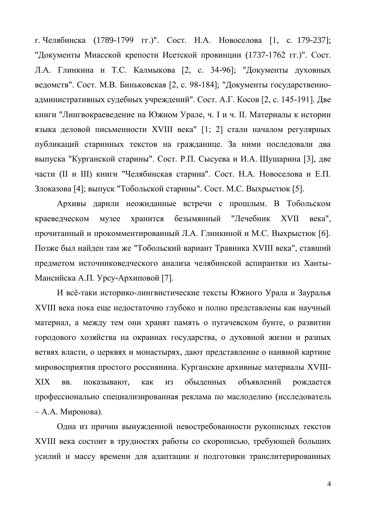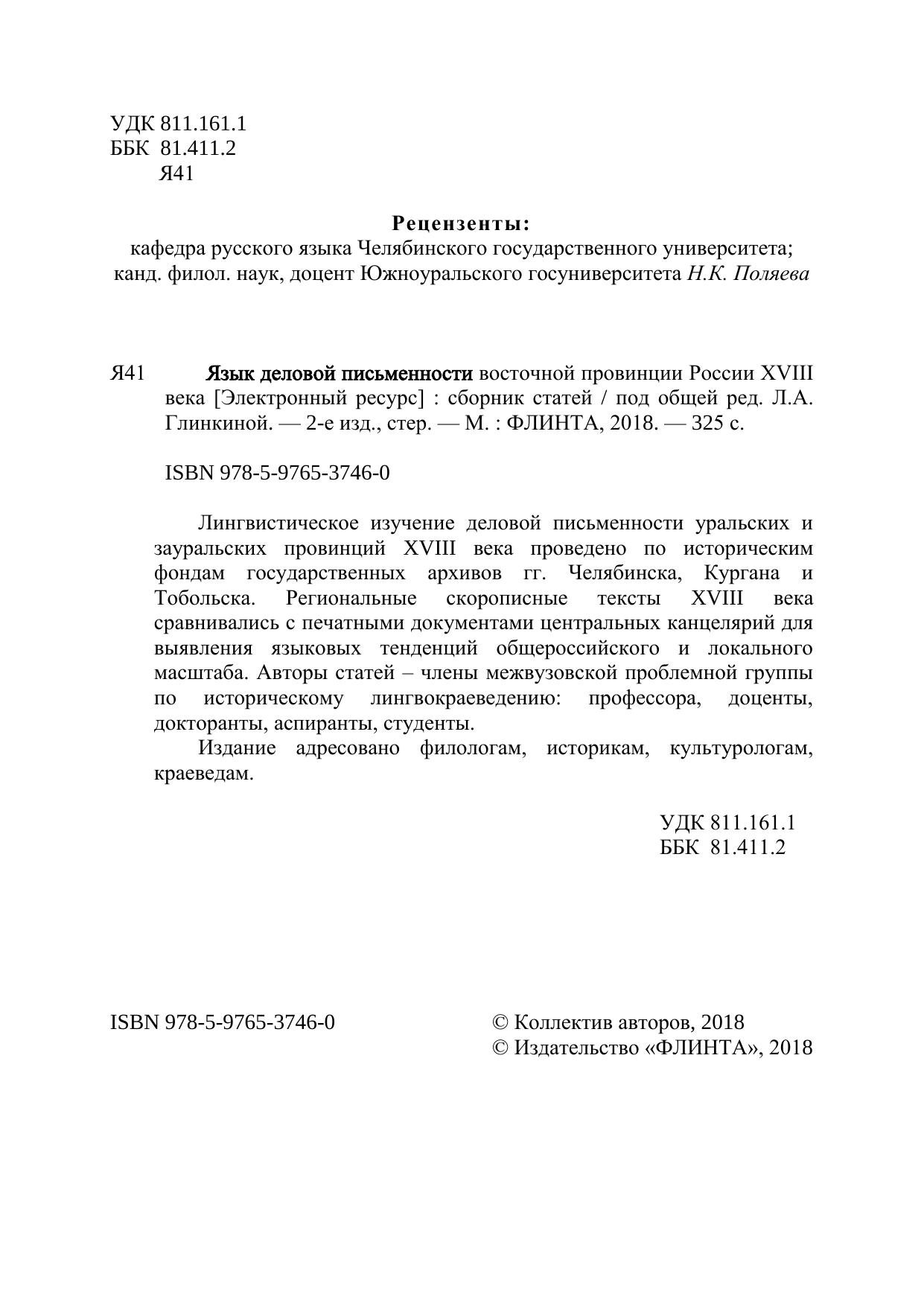 Лингвистическое изучение деловой письменности уральских и зауральских провинций XVIII века проведено по историческим фондам государственных архивов гг. Челябинска, Кургана и Тобольска. Региональные скорописные тексты XVIII века сравнивались с печатными документами центральных канцелярий для выявления языковых тенденций общероссийского и локального масштаба. Авторы статей – члены межвузовской проблемной группы по историческому лингвокраеведению: профессора, доценты, докторанты, аспиранты, студенты. Издание адресовано филологам, историкам, культурологам, краеведам.