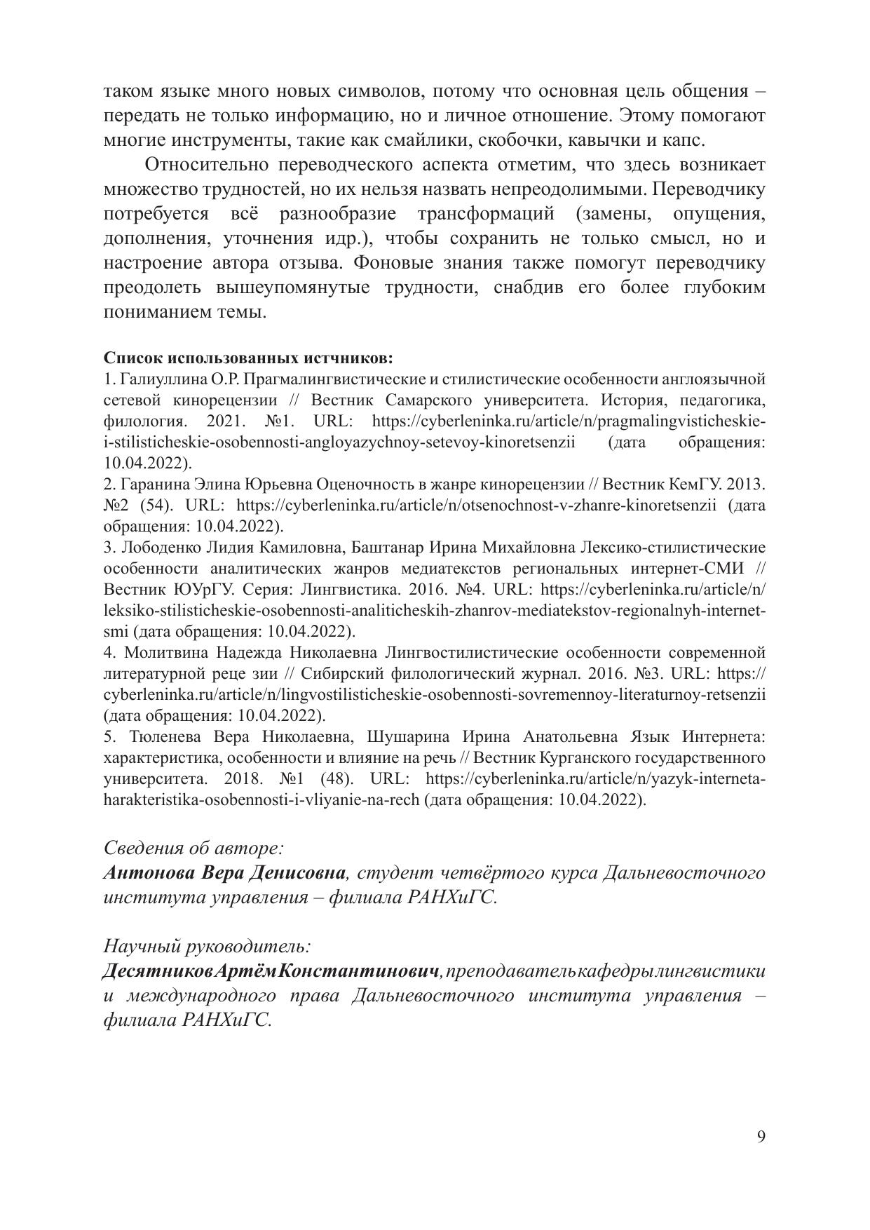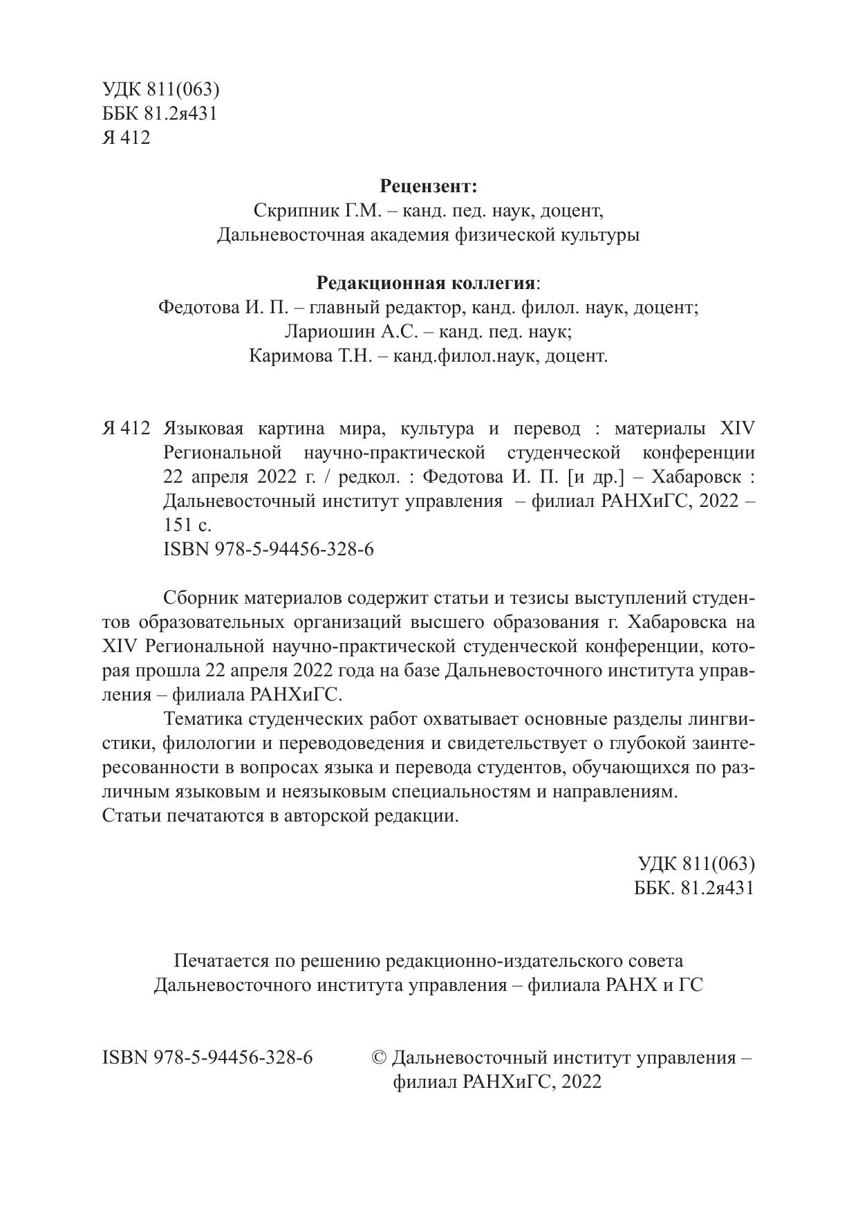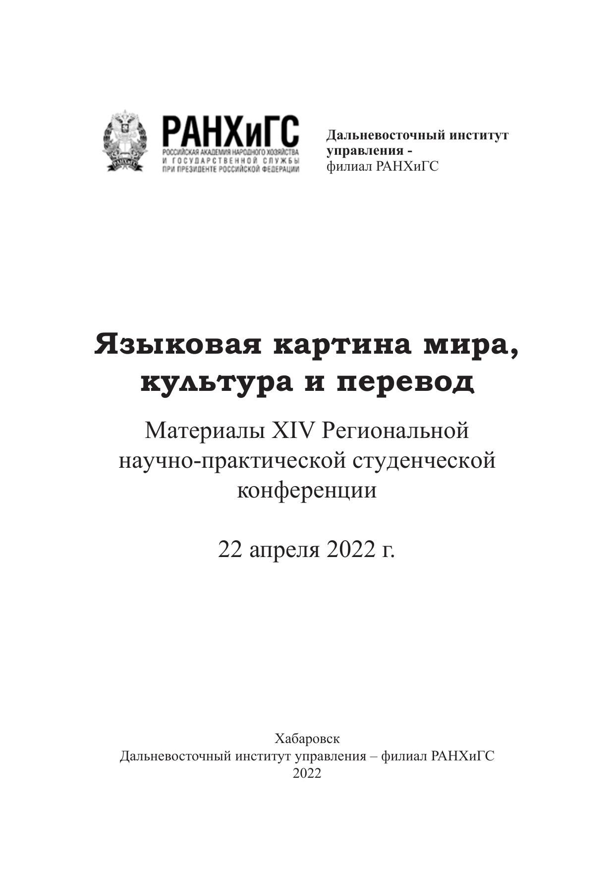 Сборник материалов содержит статьи и тезисы выступлений студентов образовательных организаций высшего образования г. Хабаровска на XIV Региональной научно-практической студенческой конференции, которая прошла 22 апреля 2022 года на базе Дальневосточного института управления – филиала РАНХиГС. Тематика студенческих работ охватывает основные разделы лингвистики, филологии и переводоведения и свидетельствует о глубокой заинтересованности в вопросах языка и перевода студентов, обучающихся по различным языковым и неязыковым специальностям и направлениям. Статьи печатаются в авторской редакции.