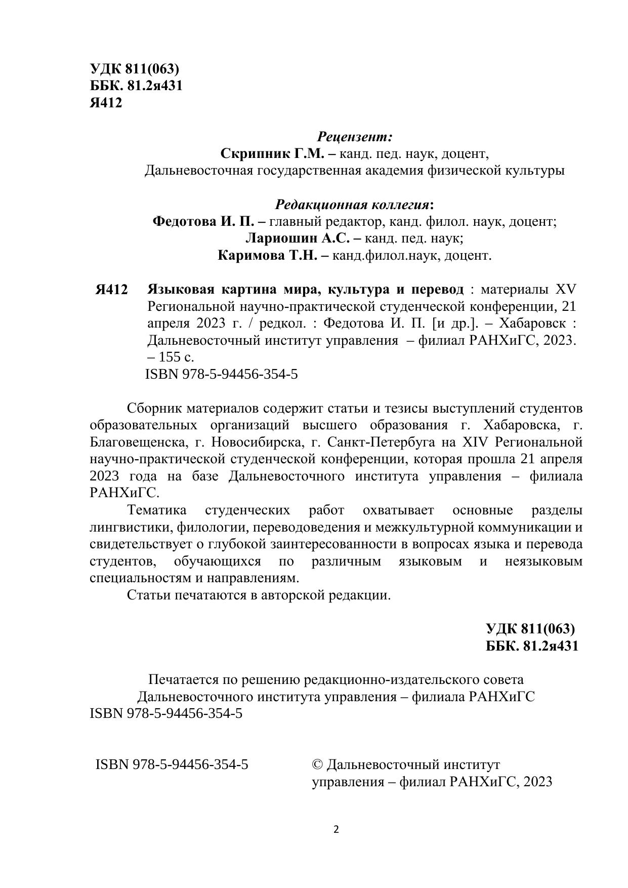 Сборник материалов содержит статьи и тезисы выступлений студентов образовательных организаций высшего образования г. Хабаровска, г. Благовещенска, г. Новосибирска, г. Санкт-Петербуга на XIV Региональной научно-практической студенческой конференции, которая прошла 21 апреля 2023 года на базе Дальневосточного института управления – филиала РАНХиГС. Тематика студенческих работ охватывает основные разделы лингвистики, филологии, переводоведения и межкультурной коммуникации и свидетельствует о глубокой заинтересованности в вопросах языка и перевода студентов, обучающихся по различным языковым и неязыковым специальностям и направлениям. Статьи печатаются в авторской редакции.