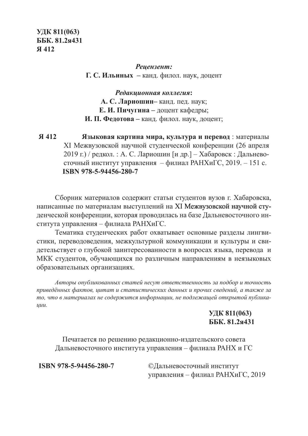 Сборник материалов содержит статьи студентов вузов г. Хабаровска, написанные по материалам выступлений на XI Межвузовской научной студенческой конференции, которая проводилась на базе Дальневосточного института управления – филиала РАНХиГС. Тематика студенческих работ охватывает основные разделы лингвистики, переводоведения, межкультурной коммуникации и культуры и свидетельствует о глубокой заинтересованности в вопросах языка, перевода и МКК студентов, обучающихся по различным направлениям в неязыковых образовательных организациях.