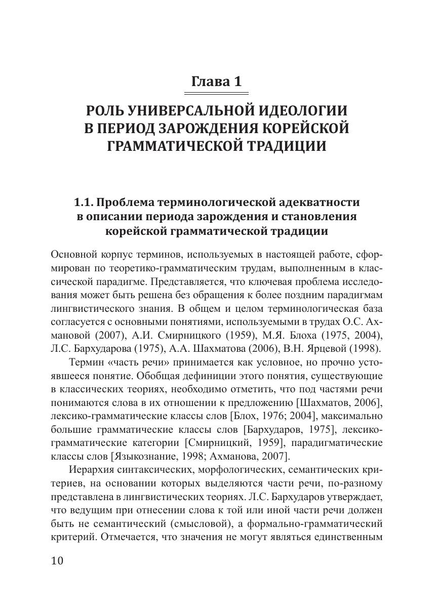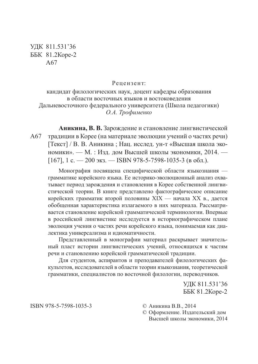 Монография посвящена специфической области языкознания — грамматике корейского языка. Ее историко-эволюционный анализ охватывает период зарождения и становления в Корее собственной лингвистической теории. В книге представлено фактографическое описание корейских грамматик второй половины XIX — начала ХХ в., дается обобщенная характеристика излагаемого в них материала. Рассматривается становление корейской грамматической терминологии. Впервые в российской лингвистике исследуется в историографическом плане эволюция учения о частях речи корейского языка, понимаемая как диалектика универсализма и идиоматичности. Представленный в монографии материал раскрывает значительный пласт истории лингвистических учений, относящихся к частям речи и становлению корейской грамматической традиции. Для студентов, аспирантов и преподавателей филологических факультетов, исследователей в области теории языкознания, теоретической