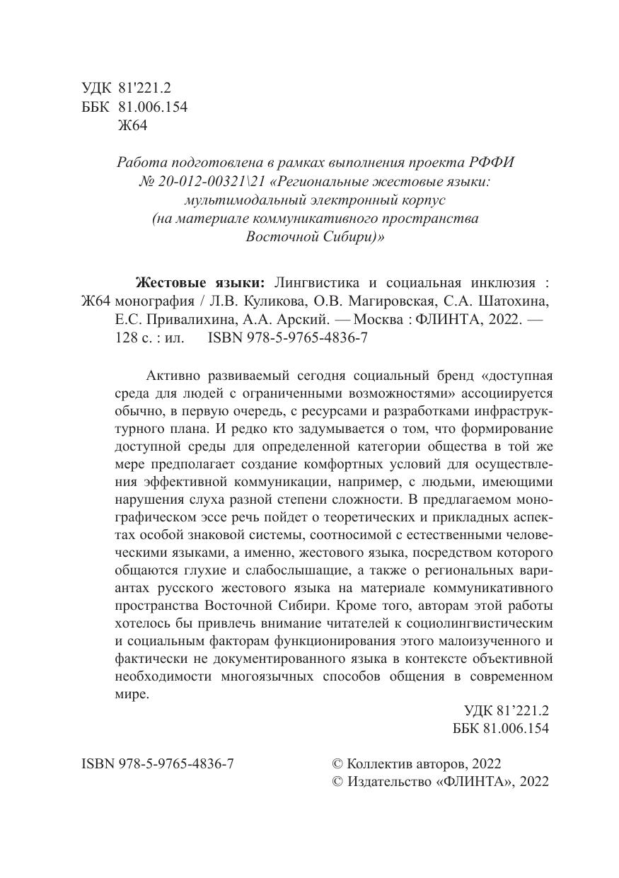 Активно развиваемый сегодня социальный бренд «доступная среда для людей с ограниченными возможностями» ассоциируется обычно, в первую очередь, с ресурсами и разработками инфраструктурного плана. И редко кто задумывается о том, что формирование доступной среды для определенной категории общества в той же мере предполагает создание комфортных условий для осуществления эффективной коммуникации, например, с людьми, имеющими нарушения слуха разной степени сложности. В предлагаемом монографическом эссе речь пойдет о теоретических и прикладных аспектах особой знаковой системы, соотносимой с естественными человеческими языками, а именно, жестового языка, посредством которого общаются глухие и слабослышащие, а также о региональных вариантах русского жестового языка на материале коммуникативного пространства Восточной Сибири. Кроме того, авторам этой работы хотелось бы привлечь внимание читателей к социолингвистическим и социальным факторам функционирования этого малоизученного и фактически не документированного языка в контексте объективной необходимости многоязычных способов общения в современном мире.