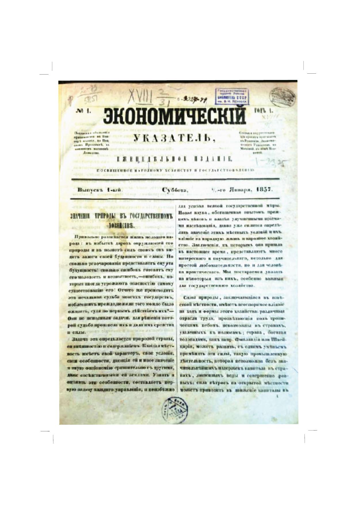 "Экономический указатель" (1857-1861) - деловое издание И.В. Вернадского