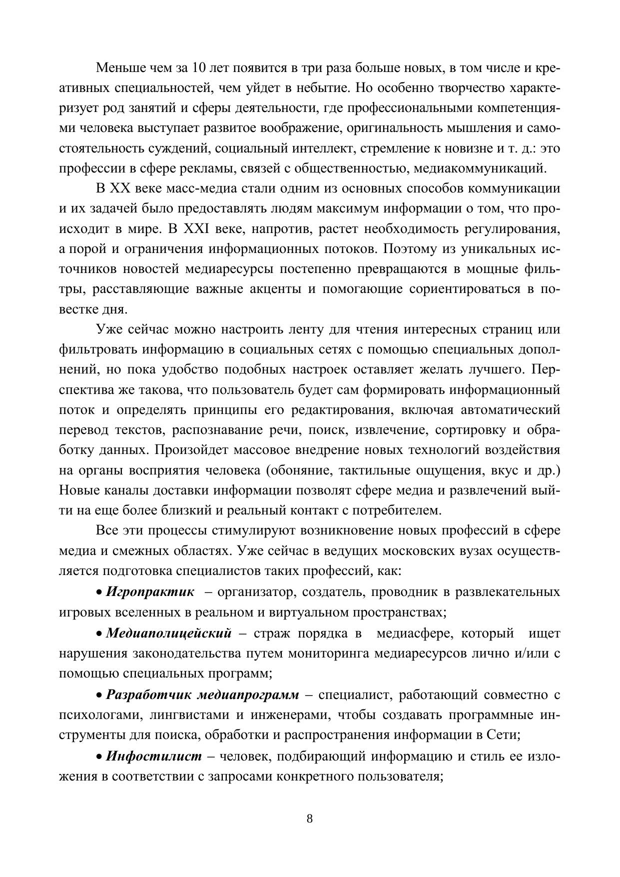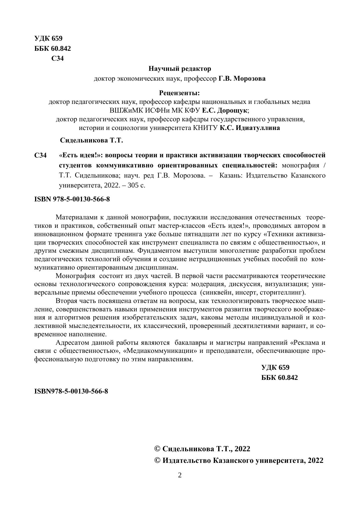 Материалами к данной монографии, послужили исследования отечественных теоретиков и практиков, собственный опыт мастер-классов «Есть идея!», проводимых автором в инновационном формате тренинга уже больше пятнадцати лет по курсу «Техники активизации творческих способностей как инструмент специалиста по связям с общественностью», и другим смежным дисциплинам. Фундаментом выступили многолетние разработки проблем педагогических технологий обучения и создание нетрадиционных учебных пособий по коммуникативно ориентированным дисциплинам. Монография состоит из двух частей. В первой части рассматриваются теоретические основы технологического сопровождения курса: модерация, дискуссия, визуализация; универсальные приемы обеспечении учебного процесса (синквейн, инсерт, сторителлинг). Вторая часть посвящена ответам на вопросы, как технологизировать творческое мышление, совершенствовать навыки применения инструментов развития творческого воображения и алгоритмов решения изобретательских задач, каковы методы индивидуальной и коллективной мыследеятельности, их классический, проверенный десятилетиями вариант, и современное наполнение. Адресатом данной работы являются бакалавры и магистры направлений «Реклама и связи с общественностью», «Медиакоммуникации» и преподаватели, обеспечивающие профессиональную подготовку по этим направлениям.