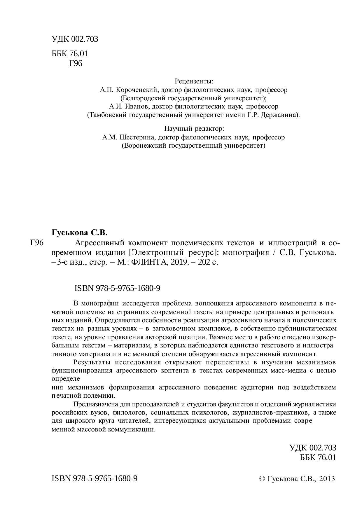 В монографии исследуется проблема воплощения агрессивного компонента в печатной полемике на страницах современной газеты на примере центральных и региональных изданий. Определяются особенности реализации агрессивного начала в полемических текстах на разных уровнях – в заголовочном комплексе, в собственно публицистическом тексте, на уровне проявления авторской позиции. Важное место в работе отведено изовербальным текстам – материалам, в которых наблюдается единство текстового и иллюстративного материала и в не меньшей степени обнаруживается агрессивный компонент. Результаты исследования открывают перспективы в изучении механизмов функционирования агрессивного контента в текстах современных масс-медиа с целью определения механизмов формирования агрессивного поведения аудитории под воздействием печатной полемики. Предназначена для преподавателей и студентов факультетов и отделений журналистики российских вузов, филологов, социальных психологов, журналистов-практиков, а также для широкого круга читателей, интересующихся актуальными проблемами современной массовой коммуникации.