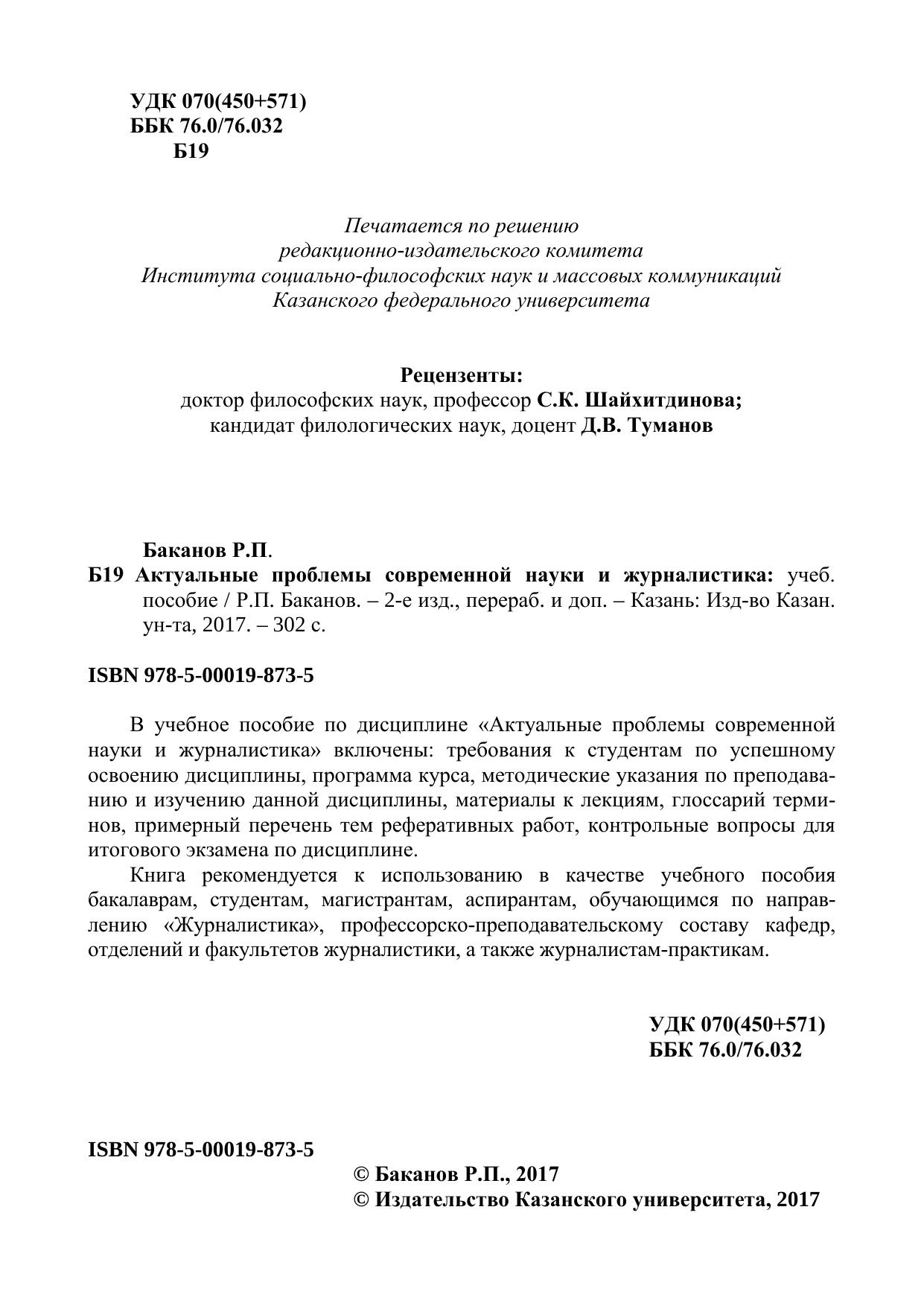 В учебное пособие по дисциплине «Актуальные проблемы современной науки и журналистика» включены: требования к студентам по успешному освоению дисциплины, программа курса, методические указания по преподаванию и изучению данной дисциплины, материалы к лекциям, глоссарий терминов, примерный перечень тем реферативных работ, контрольные вопросы для итогового экзамена по дисциплине.
