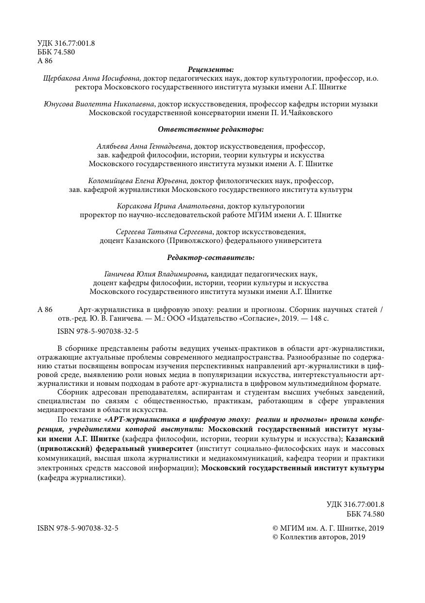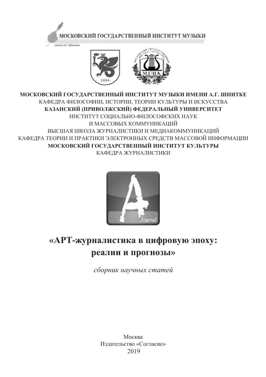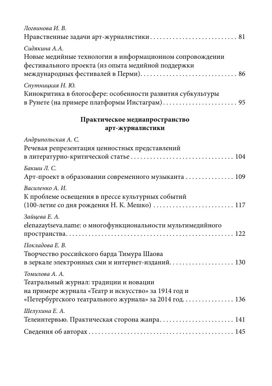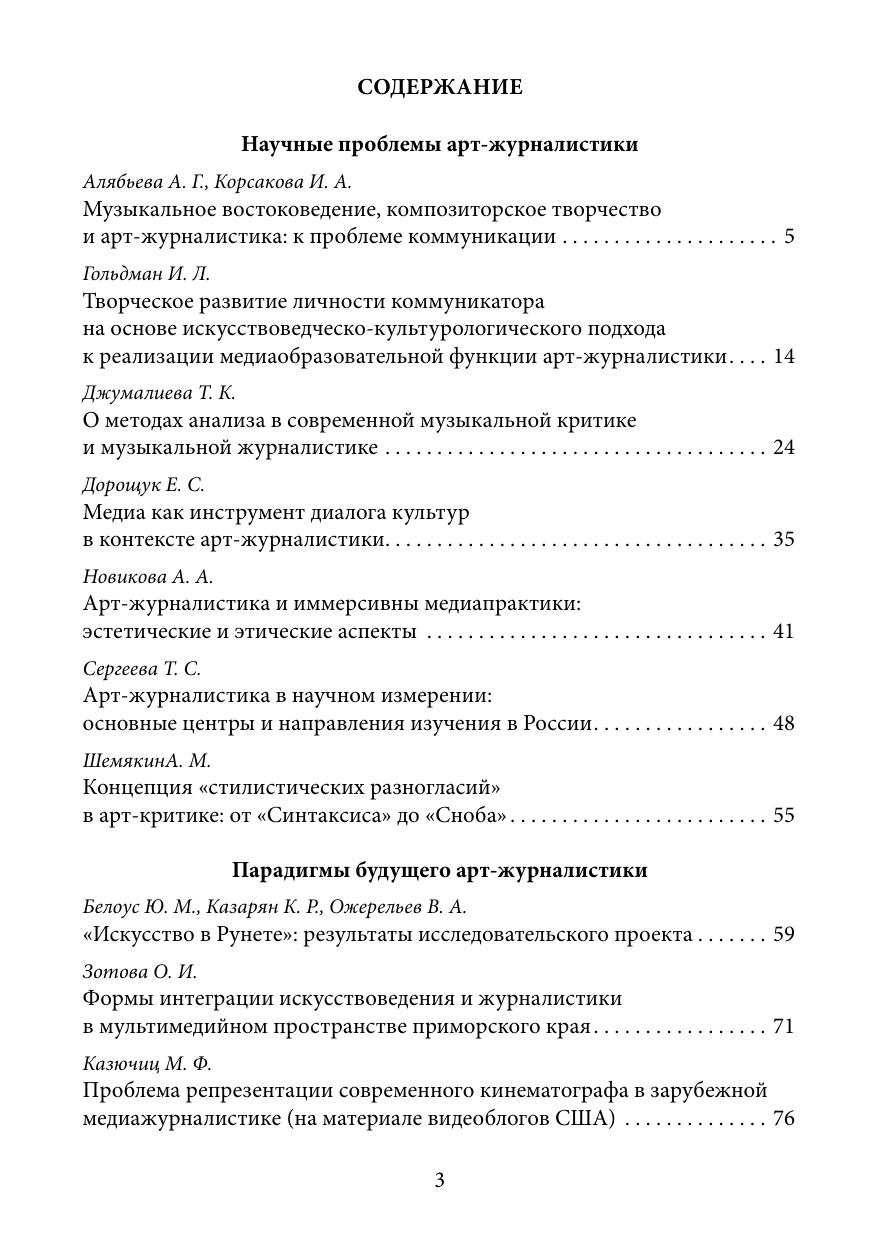 В сборнике представлены работы ведущих ученых-практиков в области арт-журналистики, отражающие актуальные проблемы современного медиапространства. Разнообразные по содержанию статьи посвящены вопросам изучения перспективных направлений арт-журналистики в цифровой среде, выявлению роли новых медиа в популяризации искусства, интертекстуальности арт- журналистики и новым подходам в работе арт-журналиста в цифровом мультимедийном формате. Сборник адресован преподавателям, аспирантам и студентам высших учебных заведений, специалистам по связям с общественностью, практикам, работающим в сфере управления медиапроектами в области искусства.