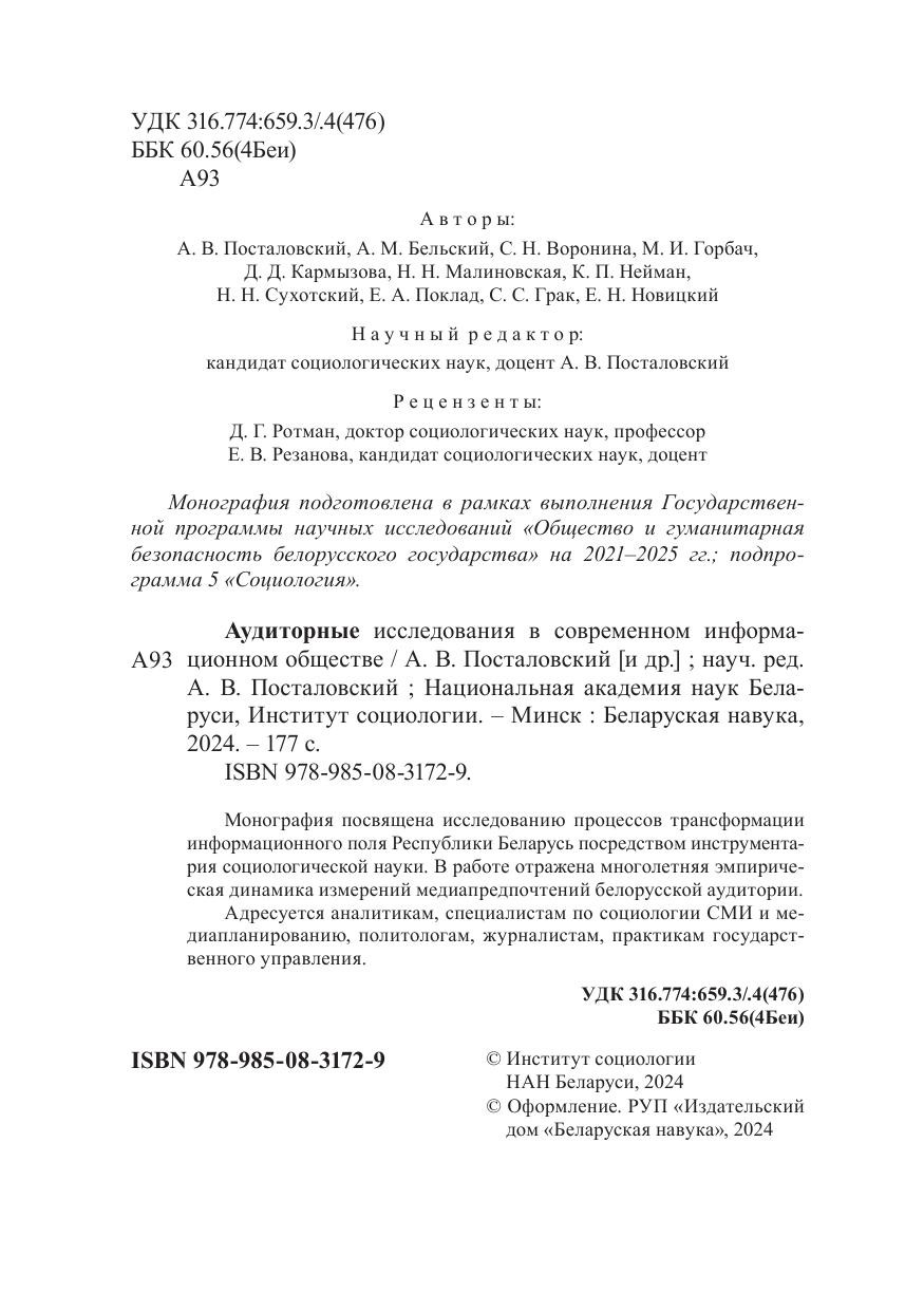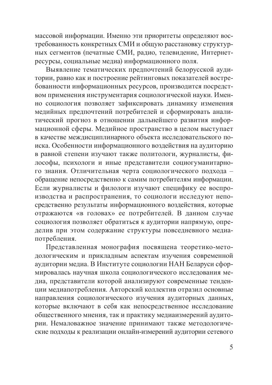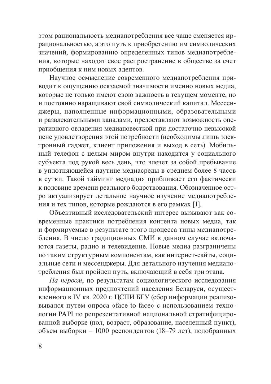 Монография посвящена исследованию процессов трансформации информационного поля Республики Беларусь посредством инструментария социологической науки. В работе отражена многолетняя эмпирическая динамика измерений медиапредпочтений белорусской аудитории.